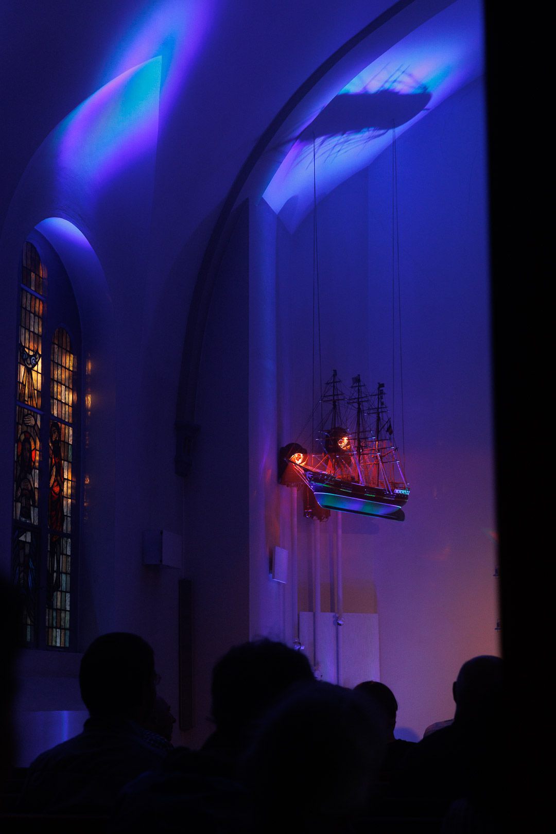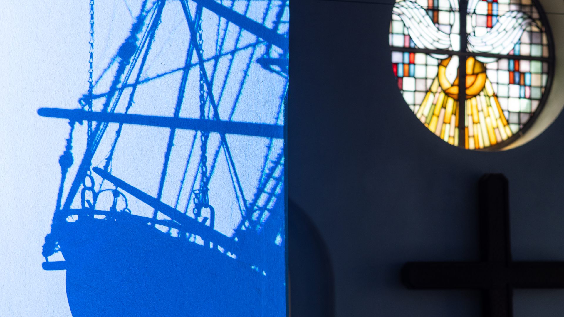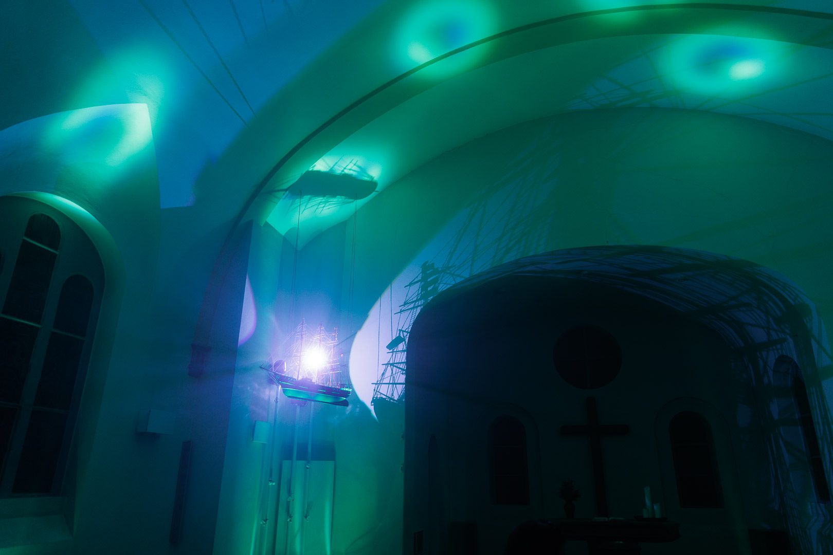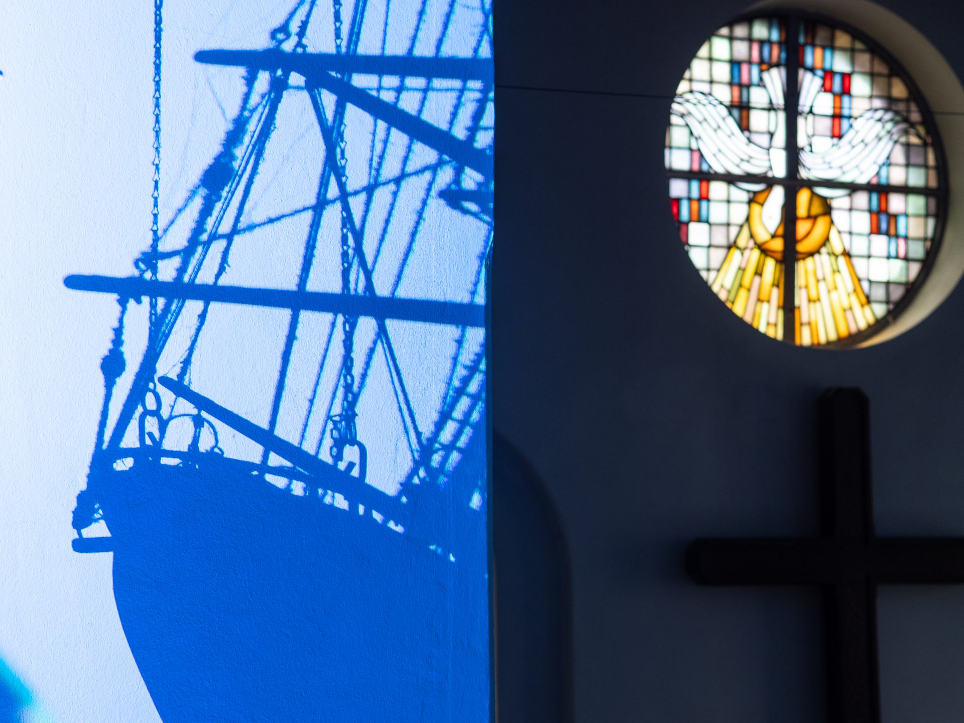 In der Kirche eröffnet eine Lichtinstallation ungewöhnliche Perspektiven auf das Schiff, das man normalerweise nur von schräg unten – quasi aus der ,Fischperspektive‘ – betrachten kann: In der Vergrößerung seines Schattens werden Details erkennbar, die dem Blick sonst verborgen bleiben. Schlaglichter auf einzelne Teile des Schiffs zerlegen es in separate Schattenbilder, die sich wie seine Bedeutungen vervielfachen und überlagern können. Während die teils farbigen Schiffsschatten über die weißen Wände, Decken und die bunten Fenster wandern, treten sie in einen Dialog mit architektonischen Elementen des Kirchenraums. Und auch den Besucher*innen kommt die Ora Et Labora so ganz nah, werden doch die Körper im Raum ebenfalls zu Projektionsflächen für die Schiffsschatten. Schließlich taucht die Installation das in der Luft schwebende Schiff mit Lichtprojektionen von bewegtem Wasser in sein ursprüngliches Element – und den ganzen Raum in eine faszinierende Klangatmosphäre von durch Luft bewegtem Wasser.