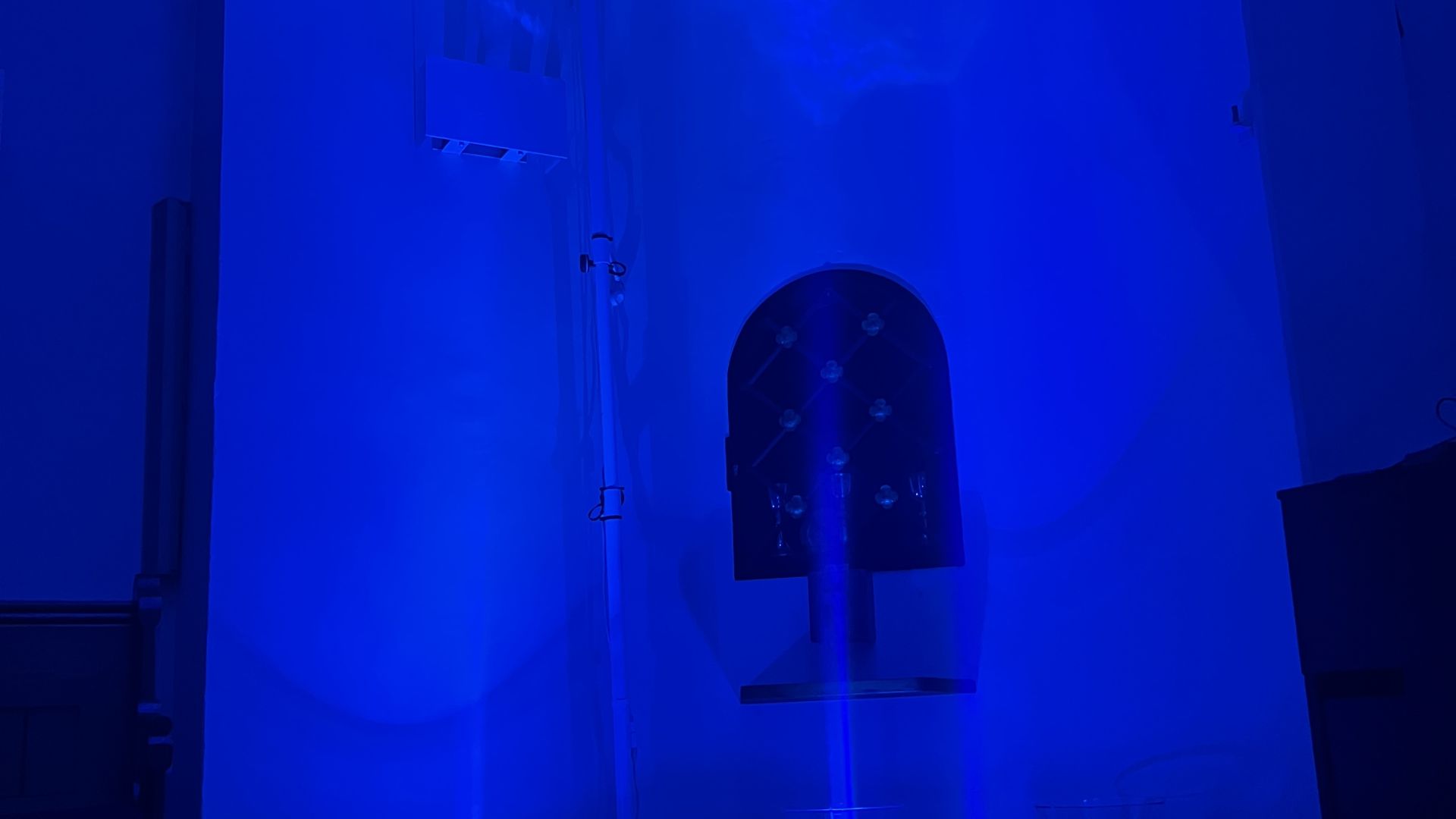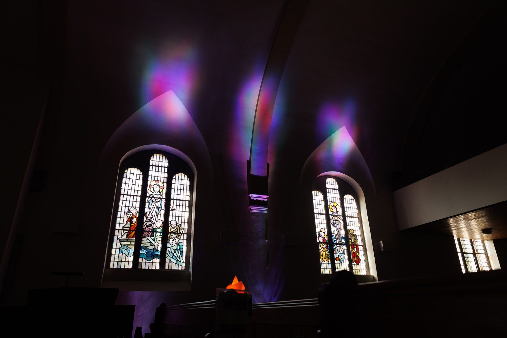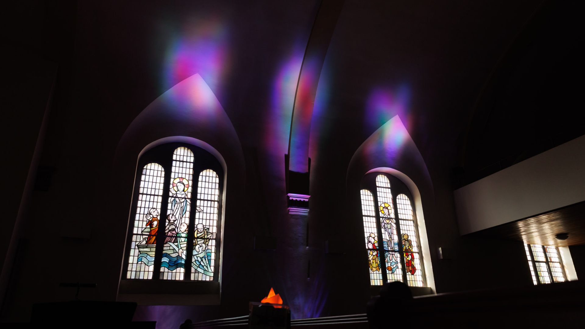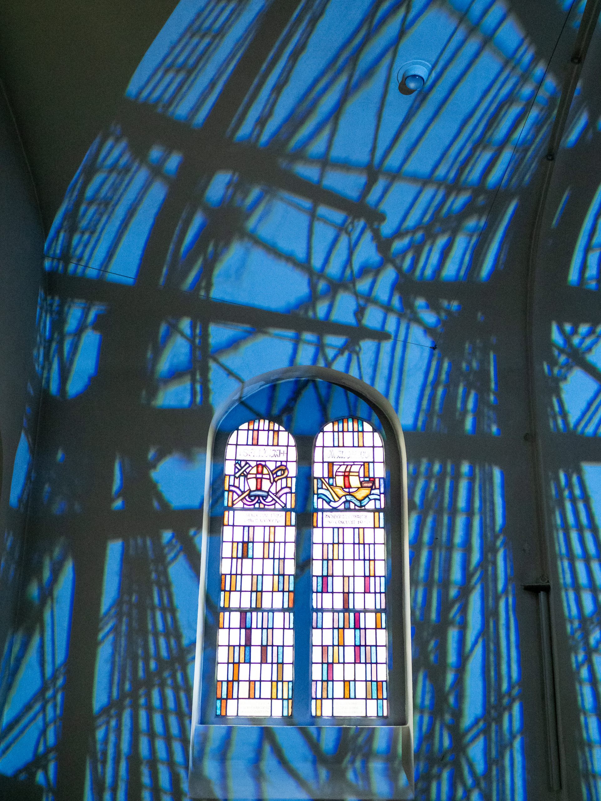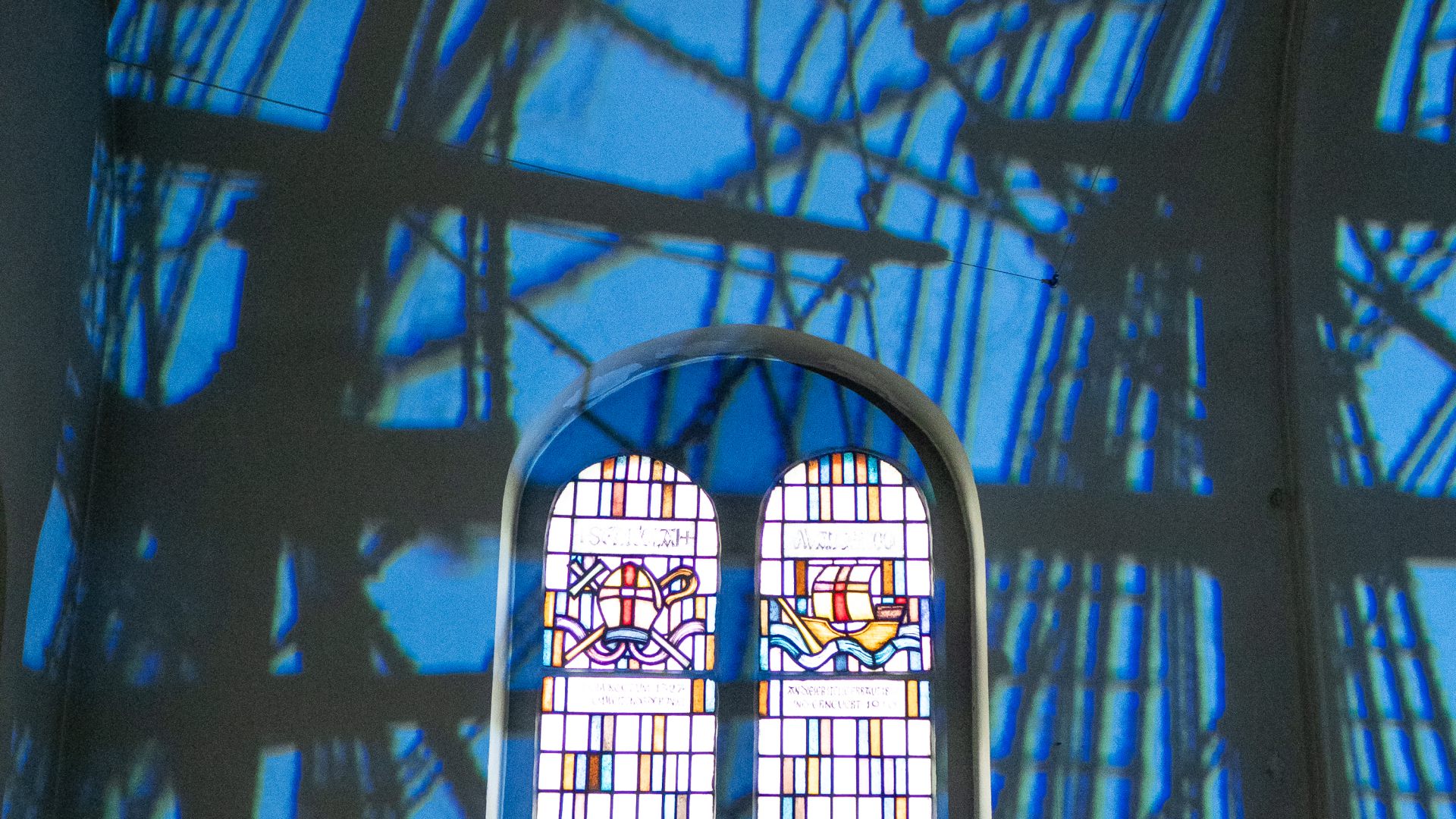 In der Kirche eröffnet eine Lichtinstallation ungewöhnliche Perspektiven auf das Schiff, das man normalerweise nur von schräg unten – quasi aus der ,Fischperspektive‘ – betrachten kann: In der Vergrößerung seines Schattens werden Details erkennbar, die dem Blick sonst verborgen bleiben. Schlaglichter auf einzelne Teile des Schiffs zerlegen es in separate Schattenbilder, die sich wie seine Bedeutungen vervielfachen und überlagern können. Während die teils farbigen Schiffsschatten über die weißen Wände, Decken und die bunten Fenster wandern, treten sie in einen Dialog mit architektonischen Elementen des Kirchenraums. Und auch den Besucher*innen kommt die Ora Et Labora so ganz nah, werden doch die Körper im Raum ebenfalls zu Projektionsflächen für die Schiffsschatten. Schließlich taucht die Installation das in der Luft schwebende Schiff mit Lichtprojektionen von bewegtem Wasser in sein ursprüngliches Element – und den ganzen Raum in eine faszinierende Klangatmosphäre von durch Luft bewegtem Wasser.