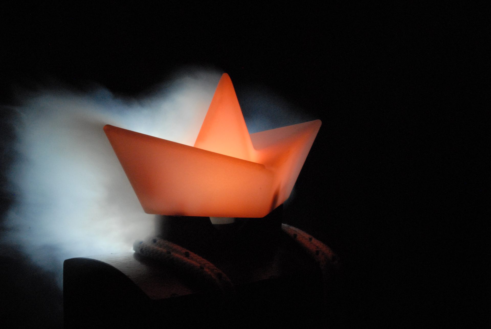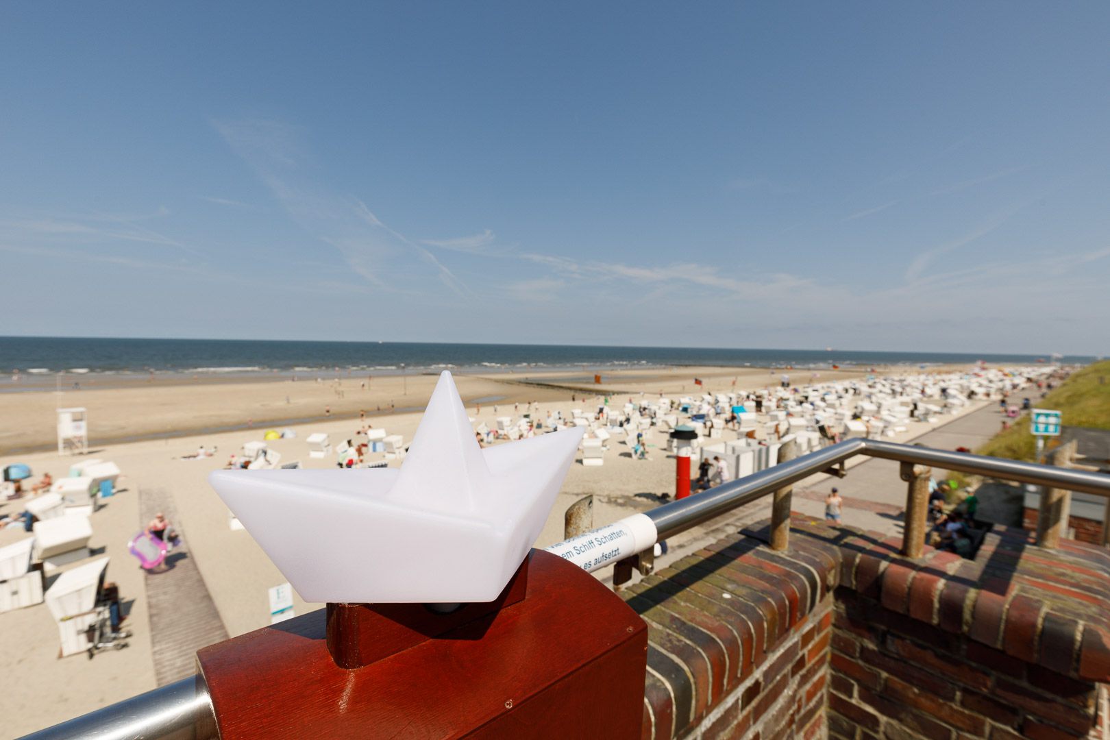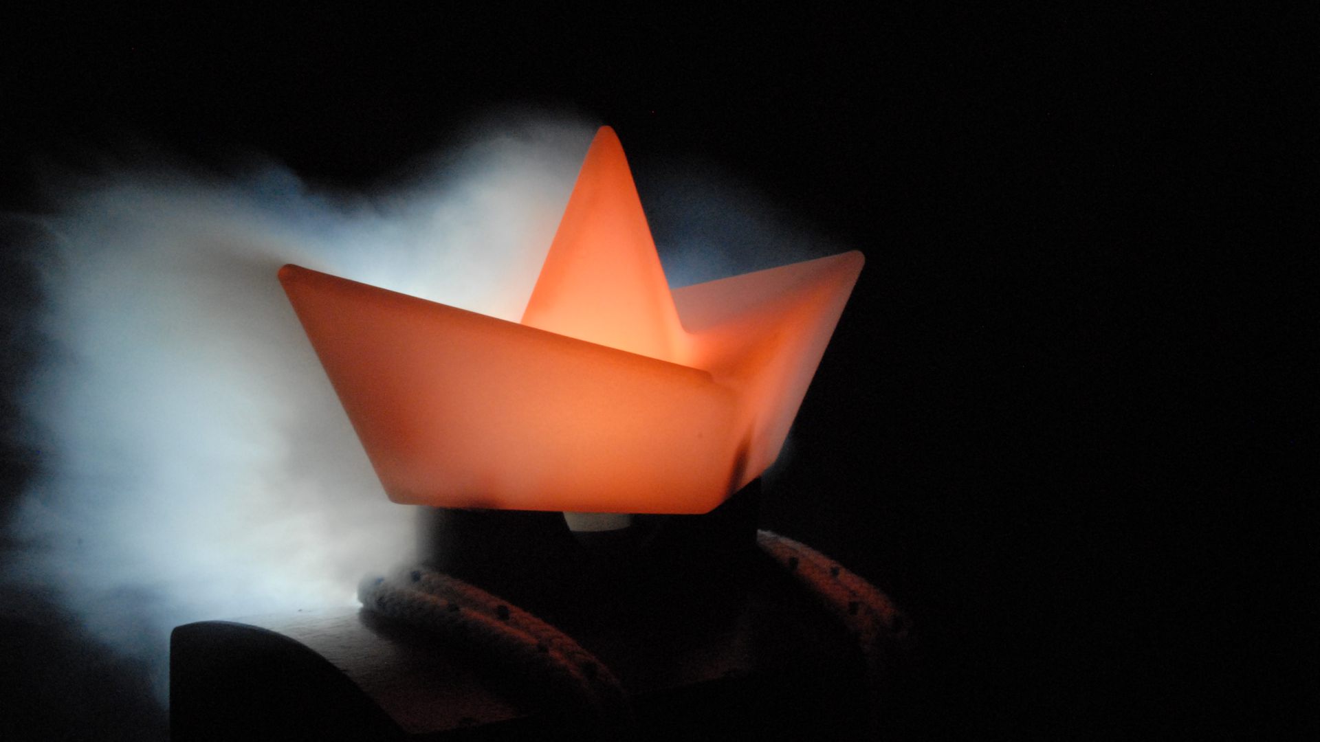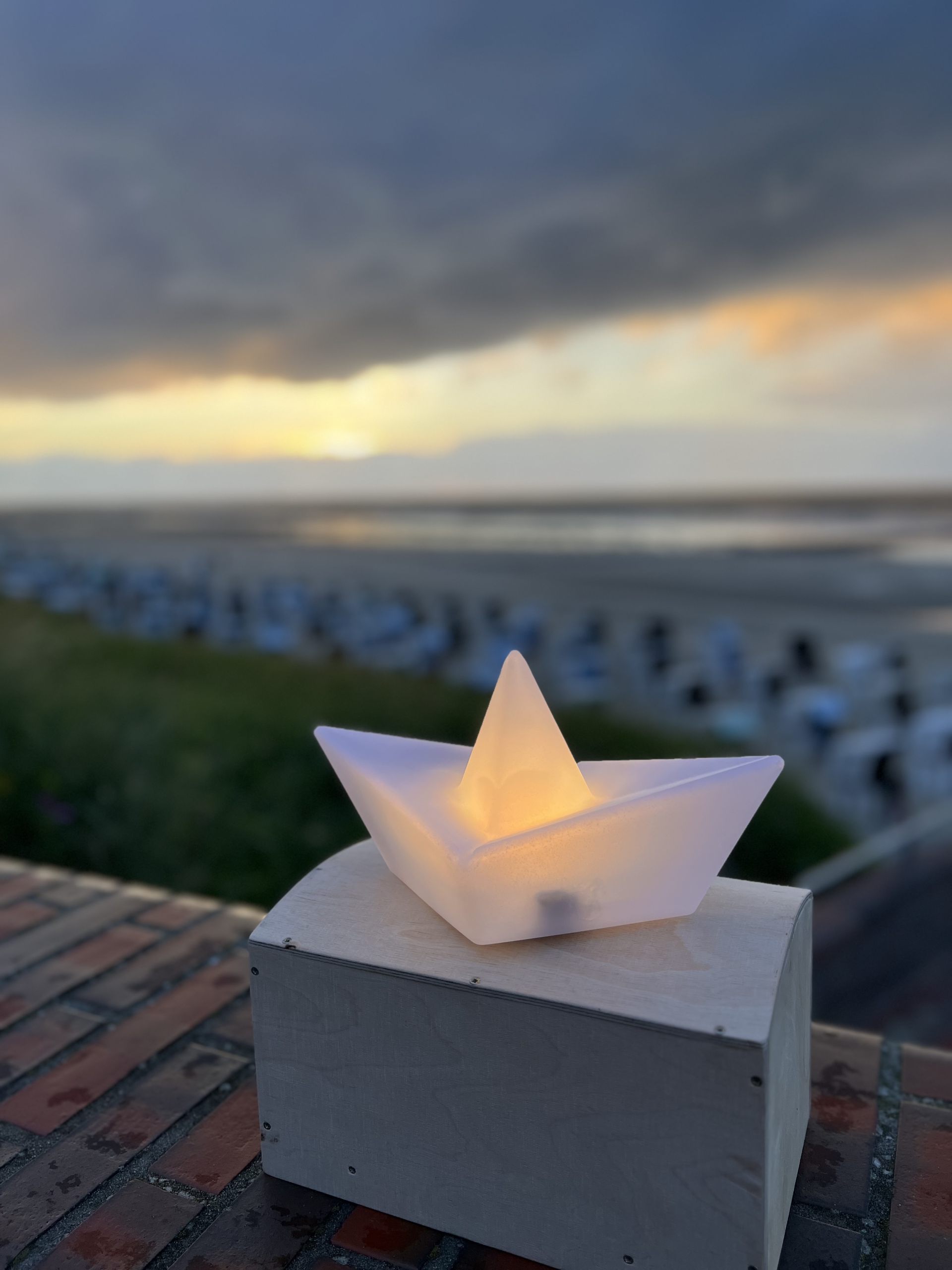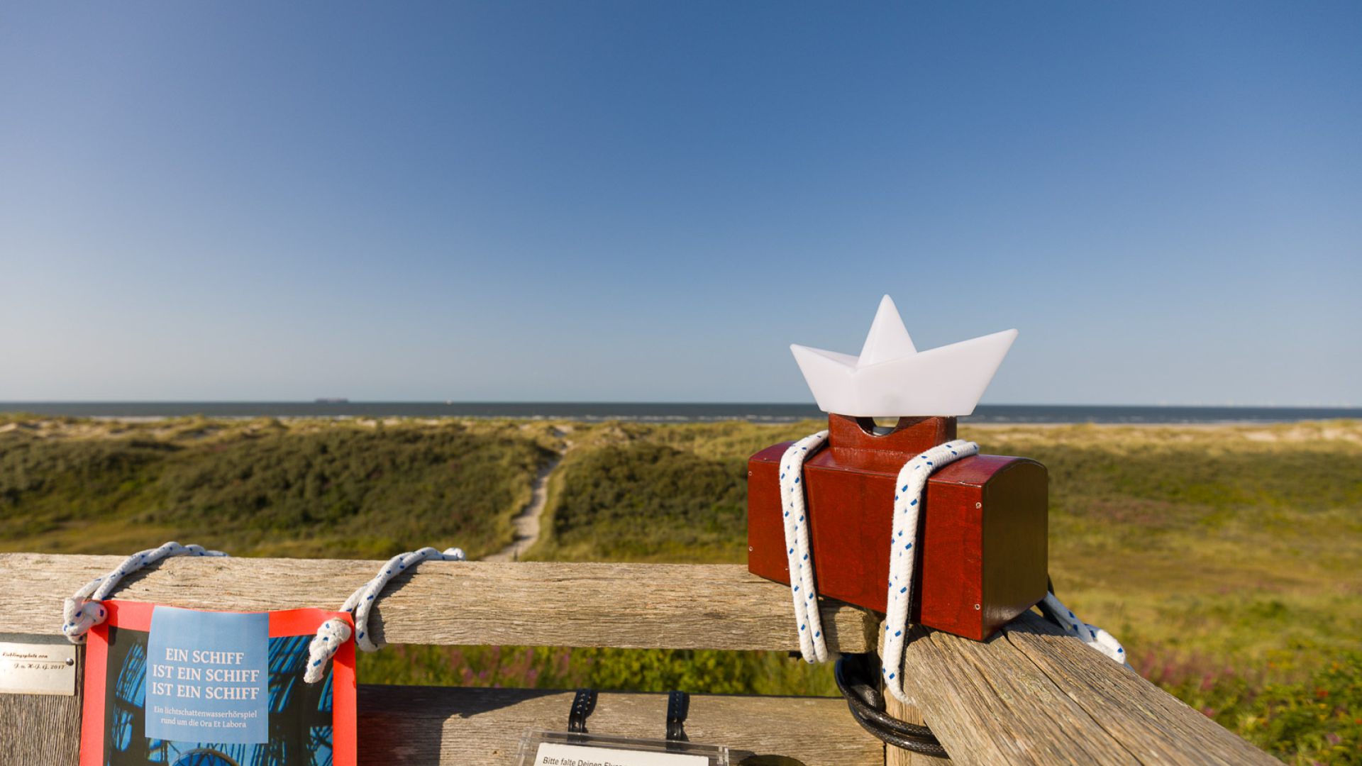 Das Projekt lädt zudem dazu ein, auf eine Faltboot-Tour über die Insel zu gehen. Faltet man den Veranstaltungsflyer zu einem Papierschiff, verwandelt er sich in den Schlüssel zu drei Erzählungen, die sich um die Ora Et Labora ranken: An Hör-Boxen am Westturm, am Uhrturm an der Promenade sowie auf der Aussichtsplattform im Osten kann man das eigene Faltschiff auf ein leuchtendes Schiff setzen und so die jeweilige Geschichte rund um die Ora Et Labora starten. Legt man in der Nikolaikirche mit dem Faltschiff, mit dem man Erzählungen gesammelt hat, an einem weiteren leuchtenden Schiff an, kann man schließlich die Installation im Kirchenraum beeinflussen: Denn das Spiel mit Licht, Schatten und Wasser in der Kirche reagiert darauf und verändert sich – je nachdem, mit wie vielen und welchen Geschichten das eigene Papierschiff bereits ,beladen‘ ist.