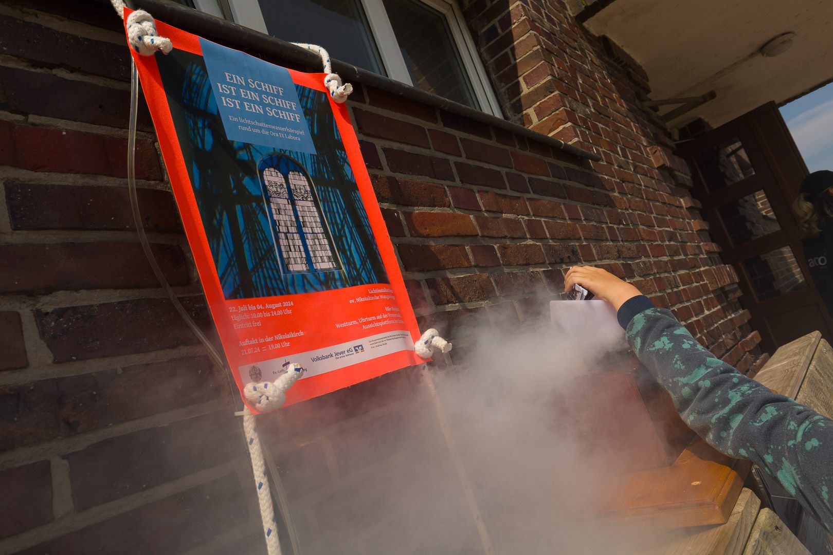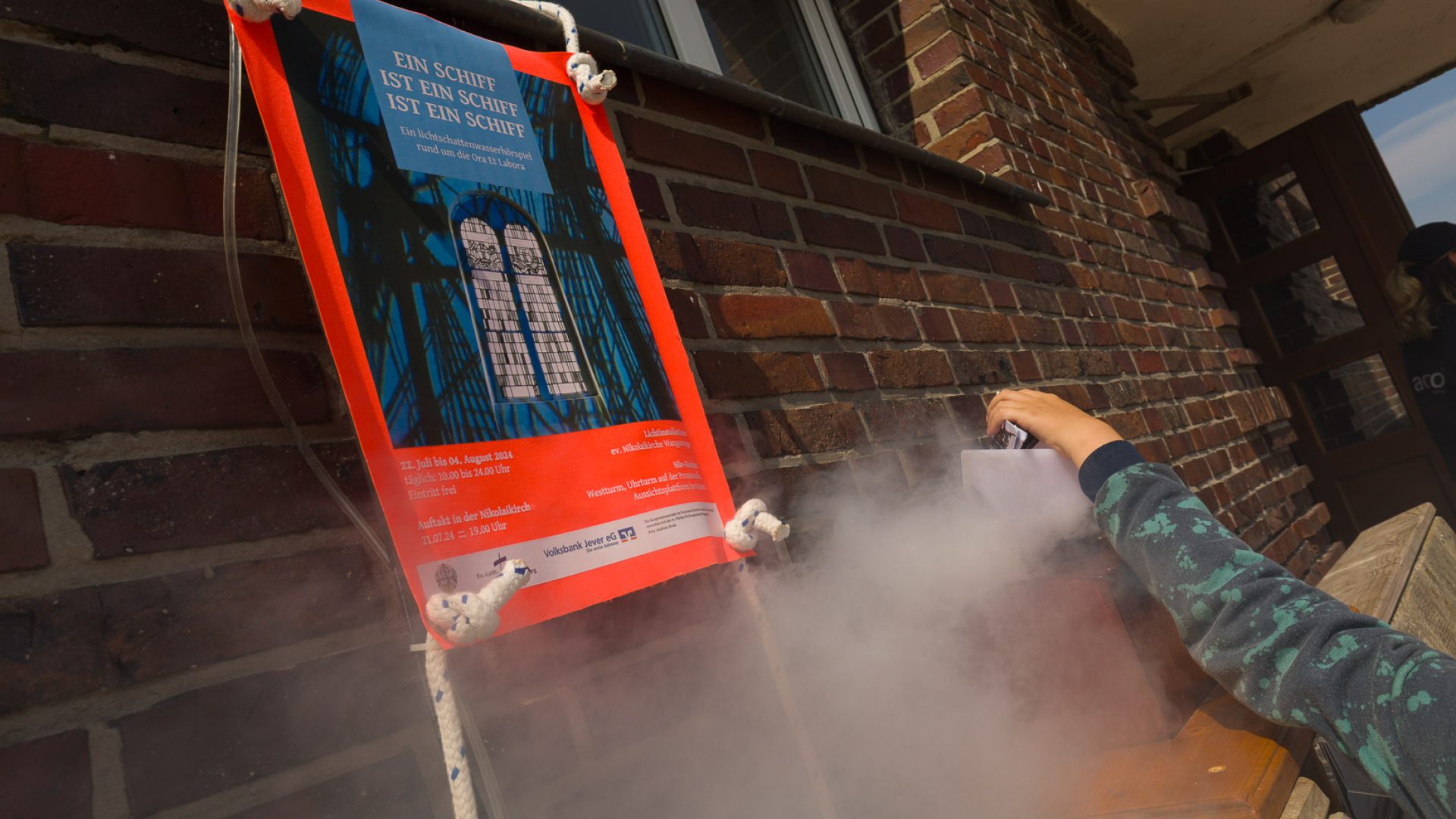 In der evangelischen Nikolaikirche auf Wangerooge hängt ein Modellschiff, das in diesem Jahr 100 Jahre alt wird. Auf den ersten Blick wirkt die Sache eindeutig und nicht weiter ungewöhnlich: Das Schiff ist – wie in vielen Kirchen in Küstenregionen – ein Symbol dafür, dass hier Seefahrt eine wichtige Rolle spielt(e). Nimmt man sich jedoch Zeit für einen zweiten und dritten Blick auf das Modellschiff und seine nunmehr 100jährige Geschichte, blättern sich schnell unterschiedlichste Facetten und teils widersprüchliche Bedeutungen auf. Mit dem interaktiven Kunstprojekt Ein Schiff ist ein Schiff ist ein Schiff beleuchten wir in Kooperation mit der evangelischen Nikolai-Kirchengemeinde Wangerooge die Ora Et Labora aus verschiedenen Perspektiven und laden dazu ein, dieses alte Objekt im Rahmen eines lichtschattenwasserhörspiels (ganz neu) zu entdecken.