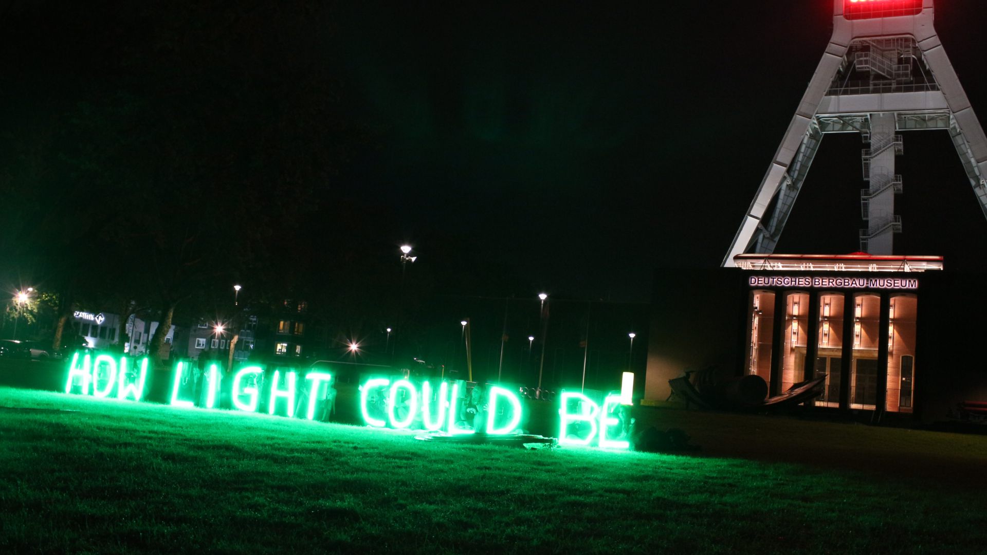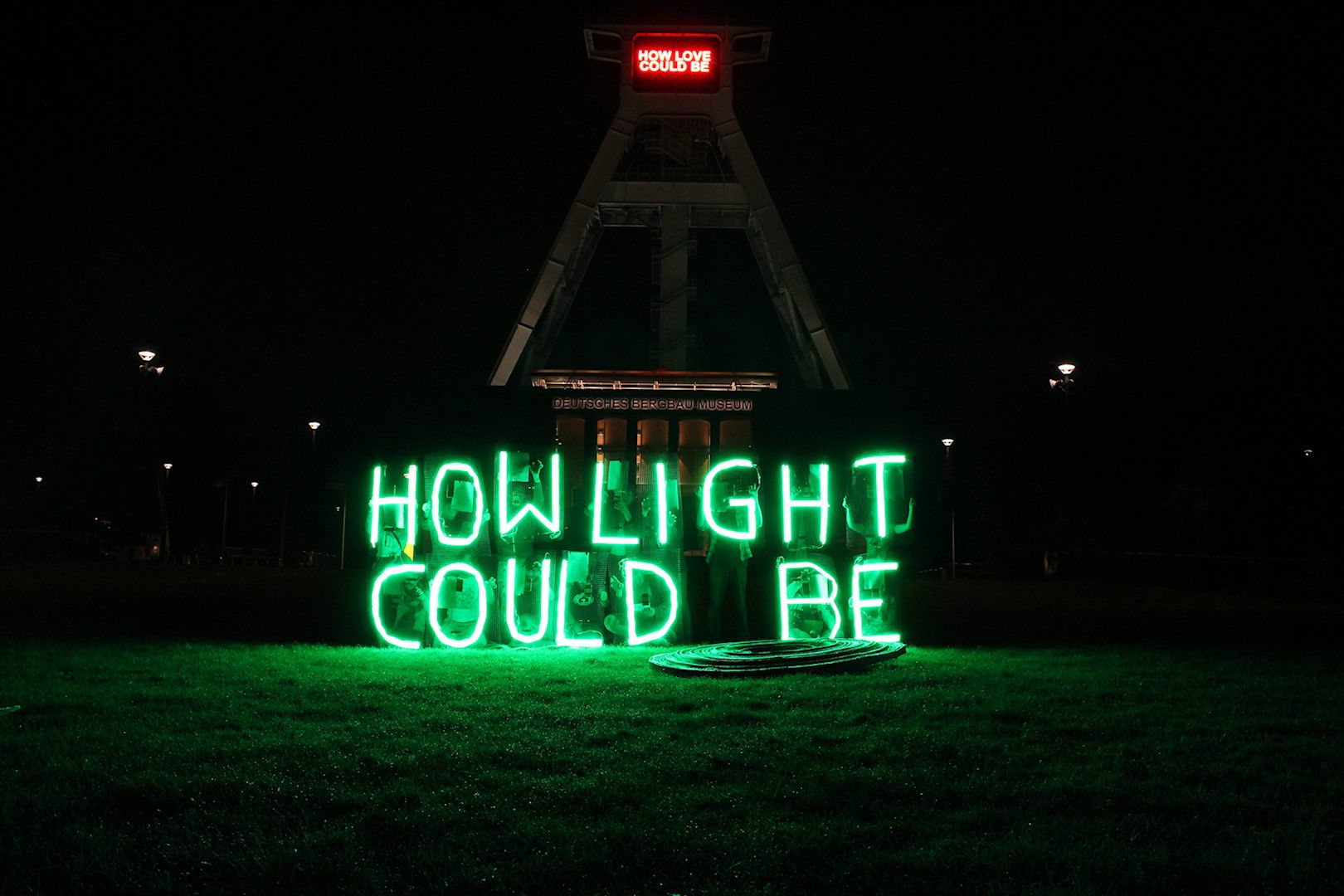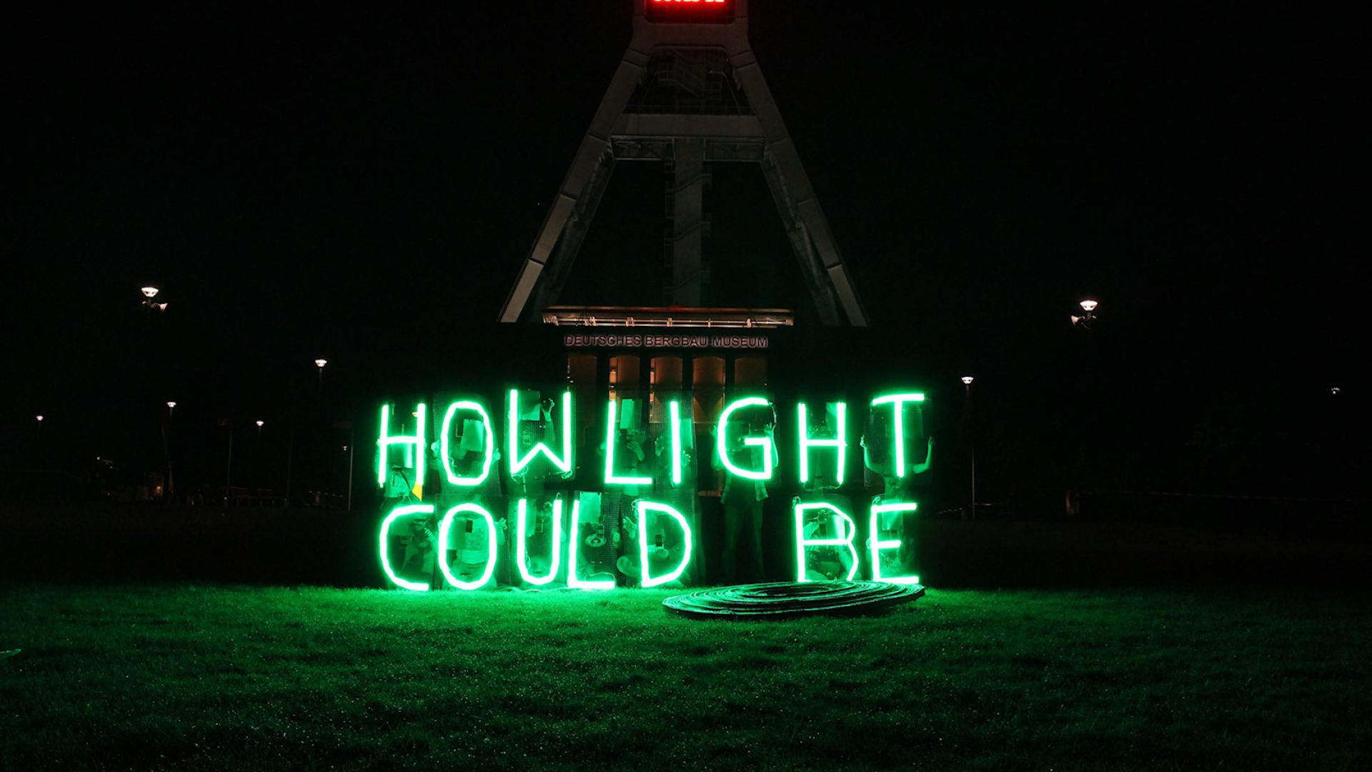 Die kollektive Intervention How Light Could Be fand am 5. Juli 2014 für die Dauer einer Stunde vor dem Deutschen Bergbaumuseum in Bochum statt. 15 PerformerInnen belebten je einen grün leuchtenden LED-Buchstaben. Wir kommentierten mit dieser Aktion das Sommerfestival des Schauspielhaus Bochum „This is not Detroit“.