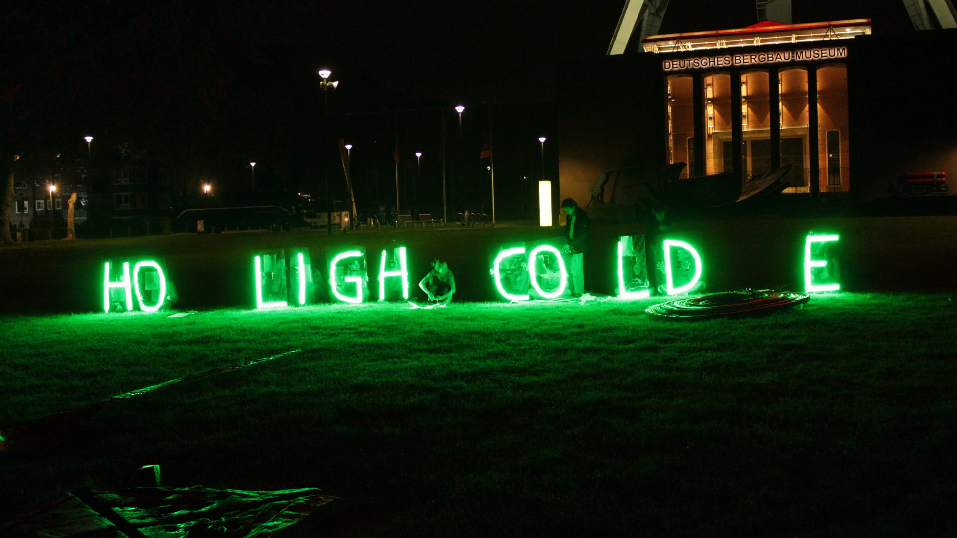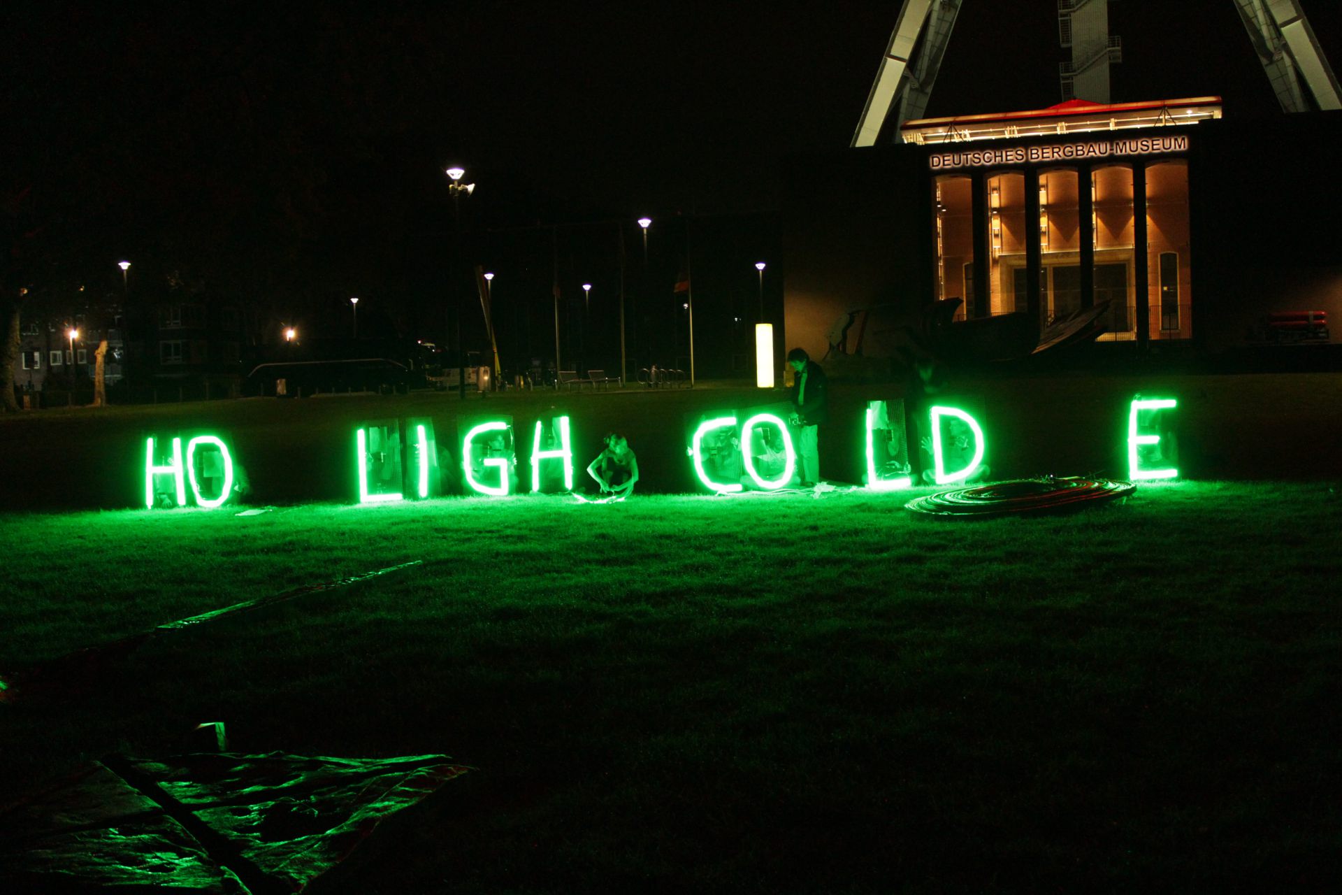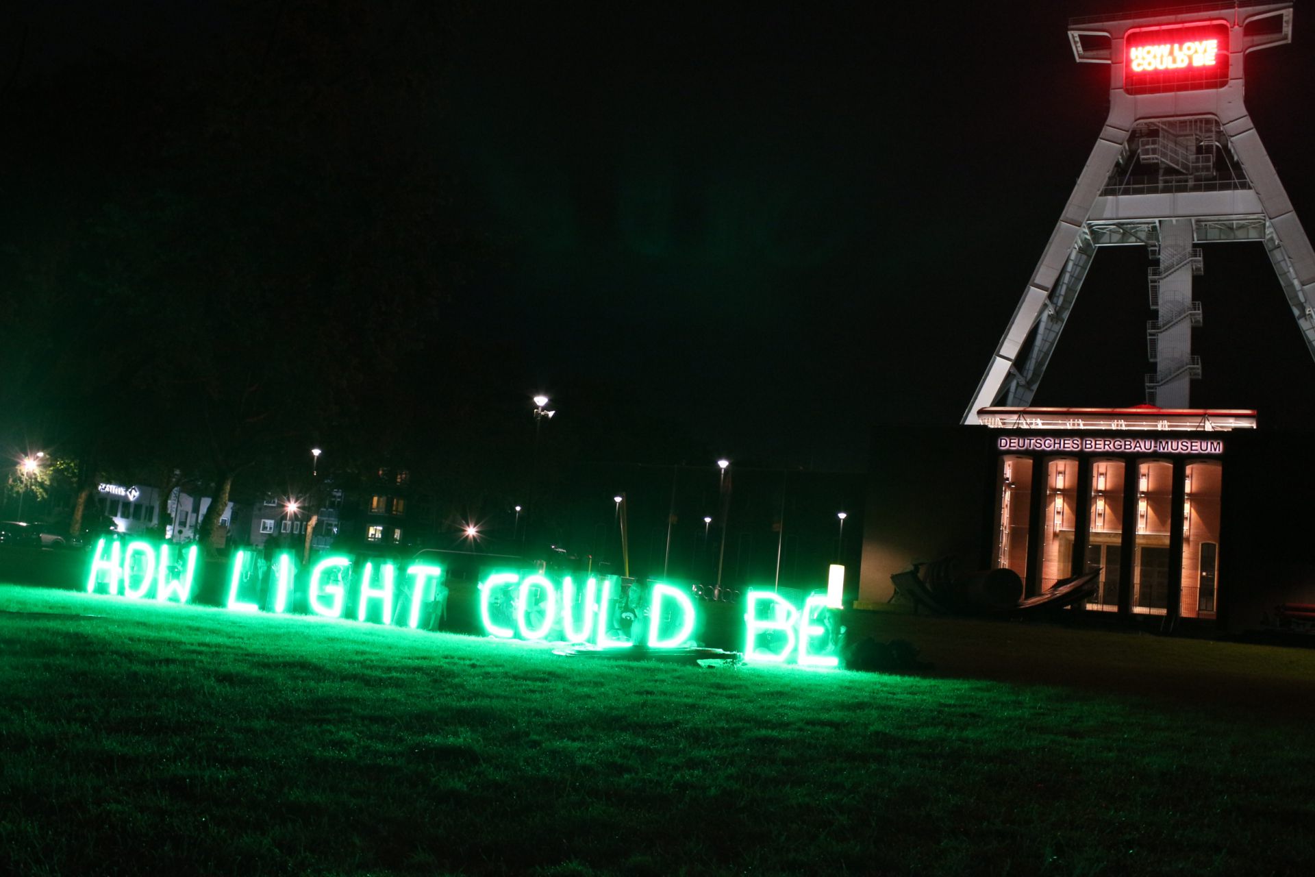 Die kollektive Intervention How Light Could Be fand am 5. Juli 2014 für die Dauer einer Stunde vor dem Deutschen Bergbaumuseum in Bochum statt. 15 PerformerInnen belebten je einen grün leuchtenden LED-Buchstaben. Wir kommentierten mit dieser Aktion das Sommerfestival des Schauspielhaus Bochum „This is not Detroit“.