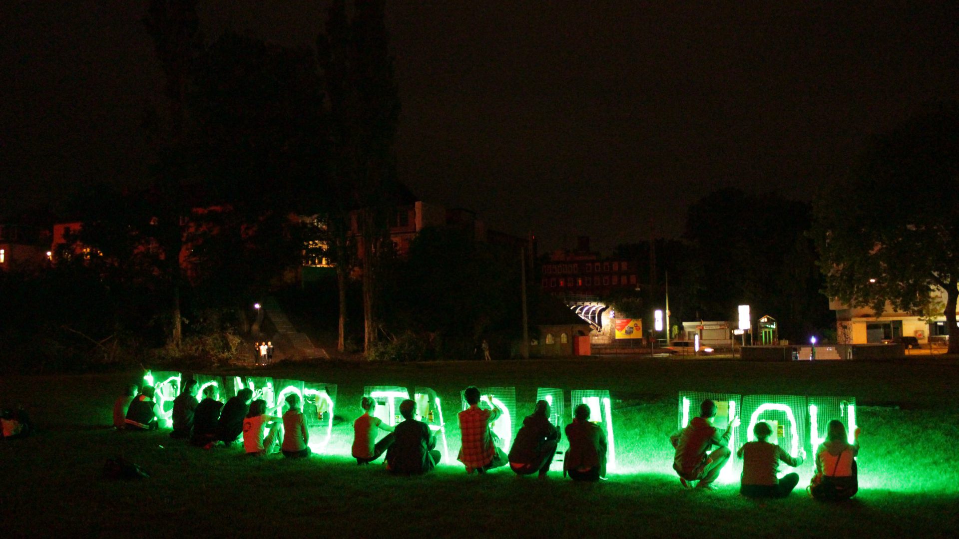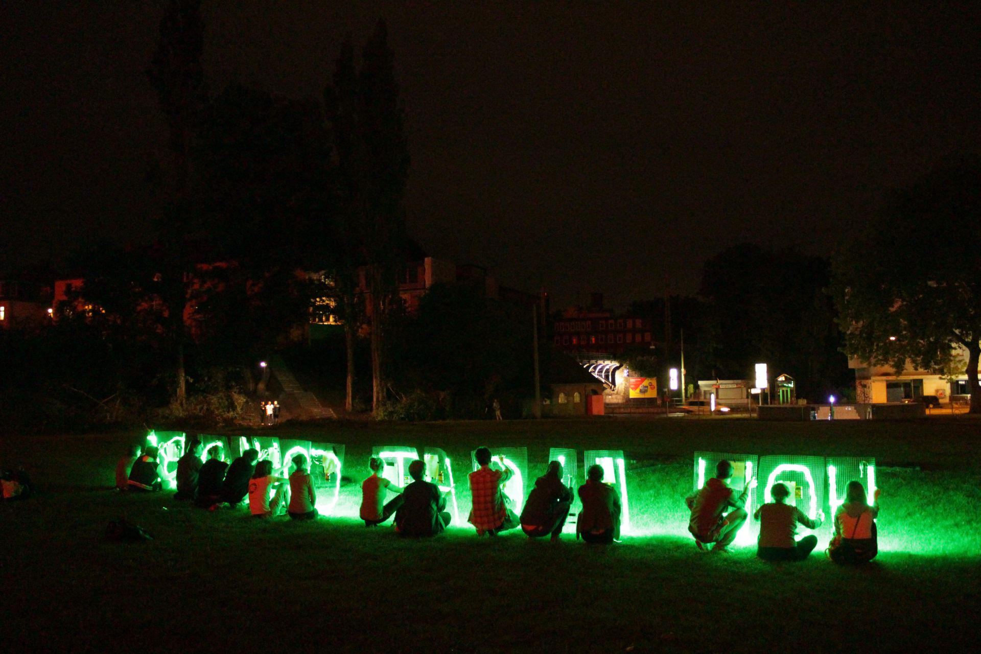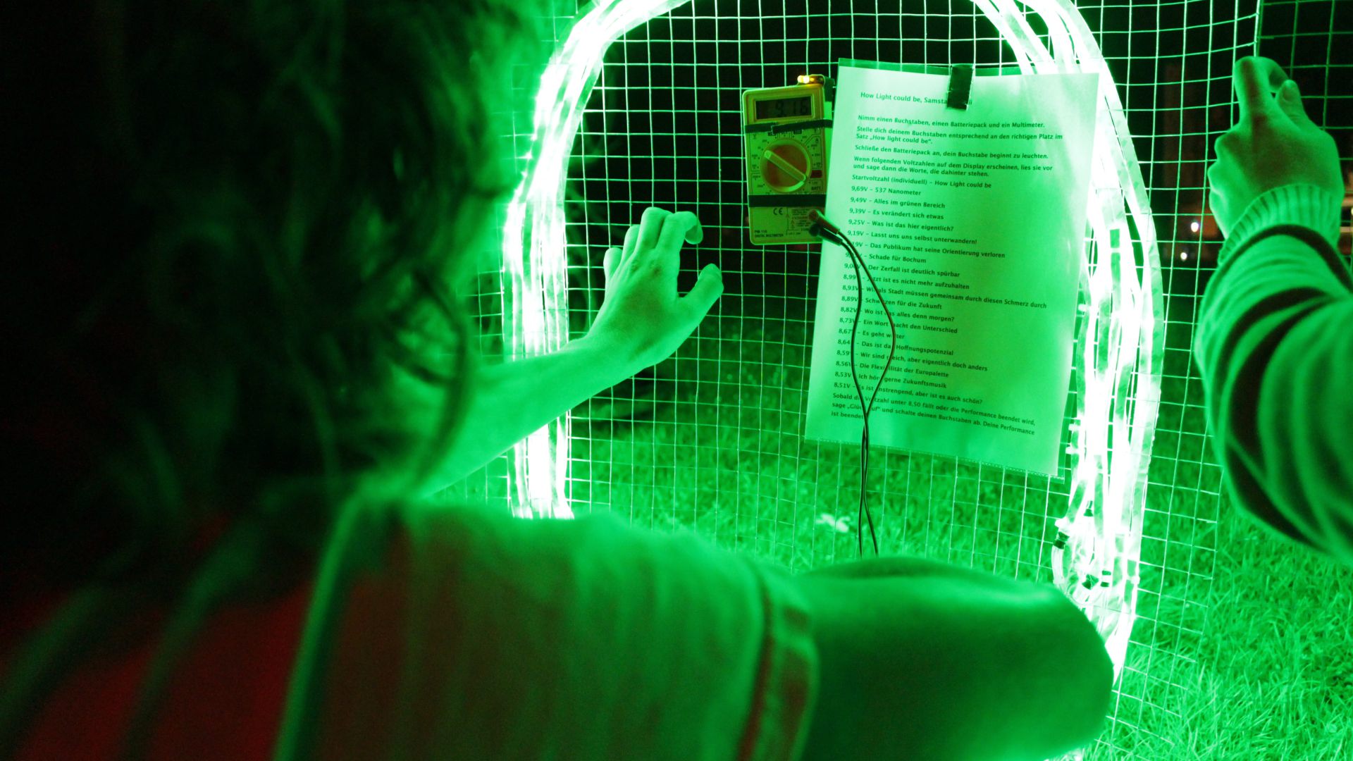 Uns ging es mit How Light Could Be darum, einen künstlerischen Kommentar zu „This is not Detroit“ und Etchells‘ Installation zu realsisieren. Zunächst sind wir How Love Could Be mit demselben Medium, einer (nur noch temporäreren) Lichtinstallation begegnet - mit LED-Buchstaben in der Komplementärfarbe zu jenen am Museumsturm. Es war uns wichtig, das eigene Medium mitzureflektieren, einerseits im Titel („Wie Licht sein könnte“), andererseits über 21 Sätze, die die 15 PerformerInnen nach Handlungsanweisungen sprachen.