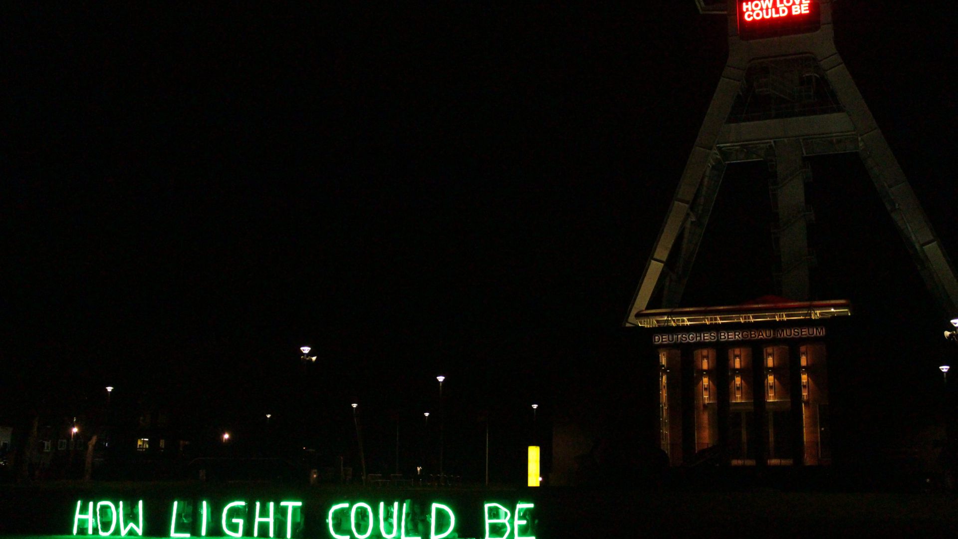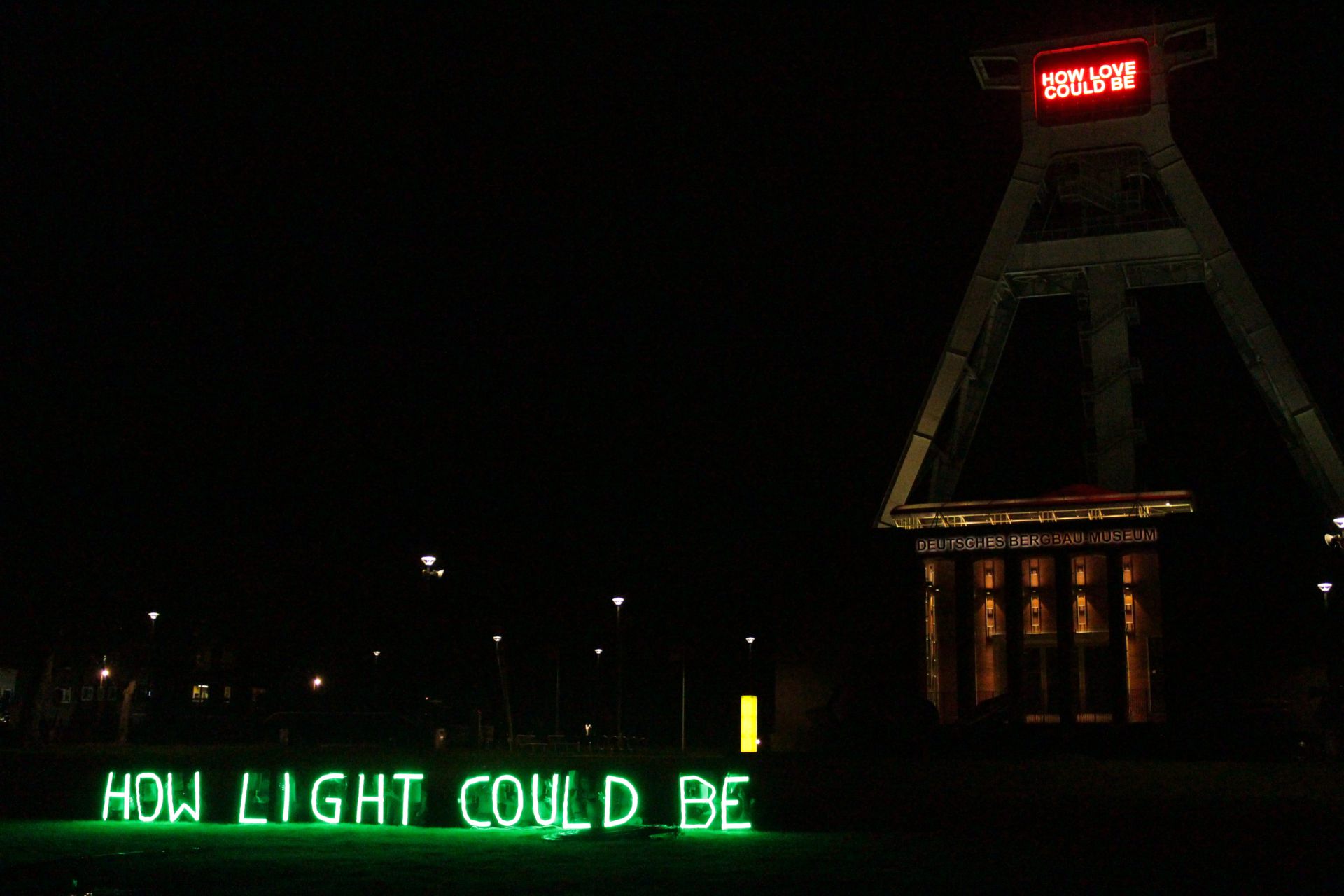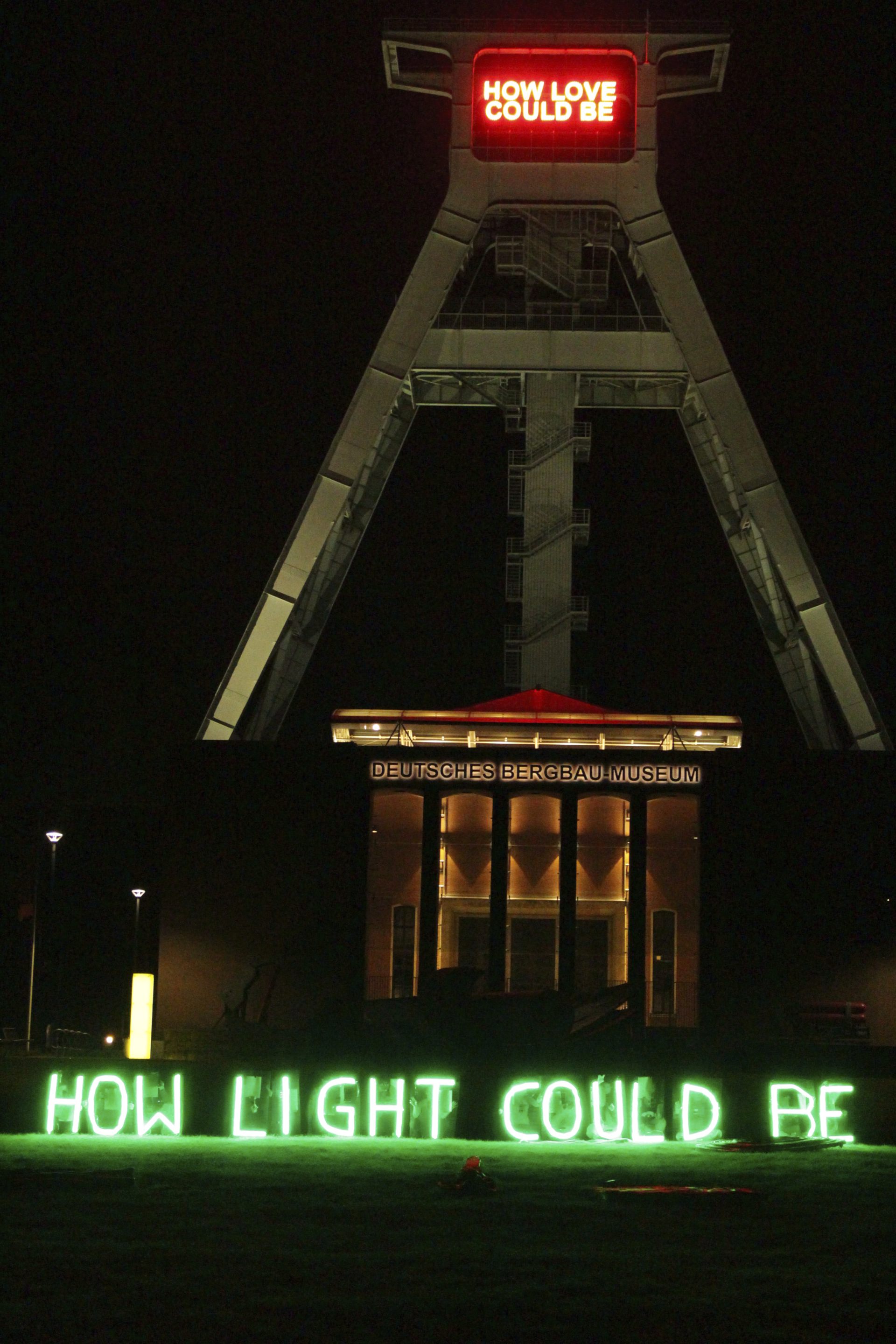 Die Arbeit, mit der dieses Festival eröffnet wurde, war Tim Etchells‘ Installation How Love Could Be am Förderturm des Deutschen Bergbaumuseums. In großen roten LED-Lettern zeigte sie eine Textzeile aus einem Song des Plattenlabels Motown aus Detroit.