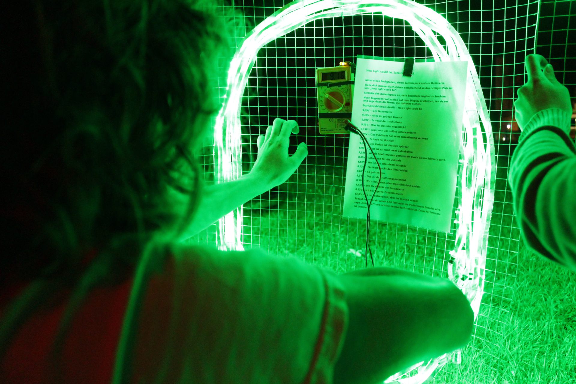 Jeder LED-Buchstabe war mit einem Energiespeicher sowie einem Spannungsmessgerät ausgestattet, das die langsame Entladung des Speichers wahrnehmbar machte. Mit bestimmten Spannungswerten waren Sprech- oder Handlungsanweisungen aus dem Kontext des Sommerfestivals verknüpft. Die Intervention zeigte damit einen Zerfallsprozesses auf zwei Ebenen auf: Den Zerfall eines weiteren Industriezweiges in Bochum sowie den Zerfall unserer eigenen Installation. Über die Sprechanweisungen stellte How Light Could Be auch die Frage nach der Nachhaltigkeit des Schauspielhaus-Festivals, das die Veränderung des Stadtbildes und der Stadtstruktur diskutierte: Nicht nur waren nahezu alle Arbeiten im Rahmen des Festivals temporärer Art und wurden nach Festivalende wieder abgebaut, auch scheinen aus der Initiative keine langfristig tragfähigen Strukturen entstanden zu sein, die immer wieder aufs Neue flüchtige Kunst hervorbringen können.
