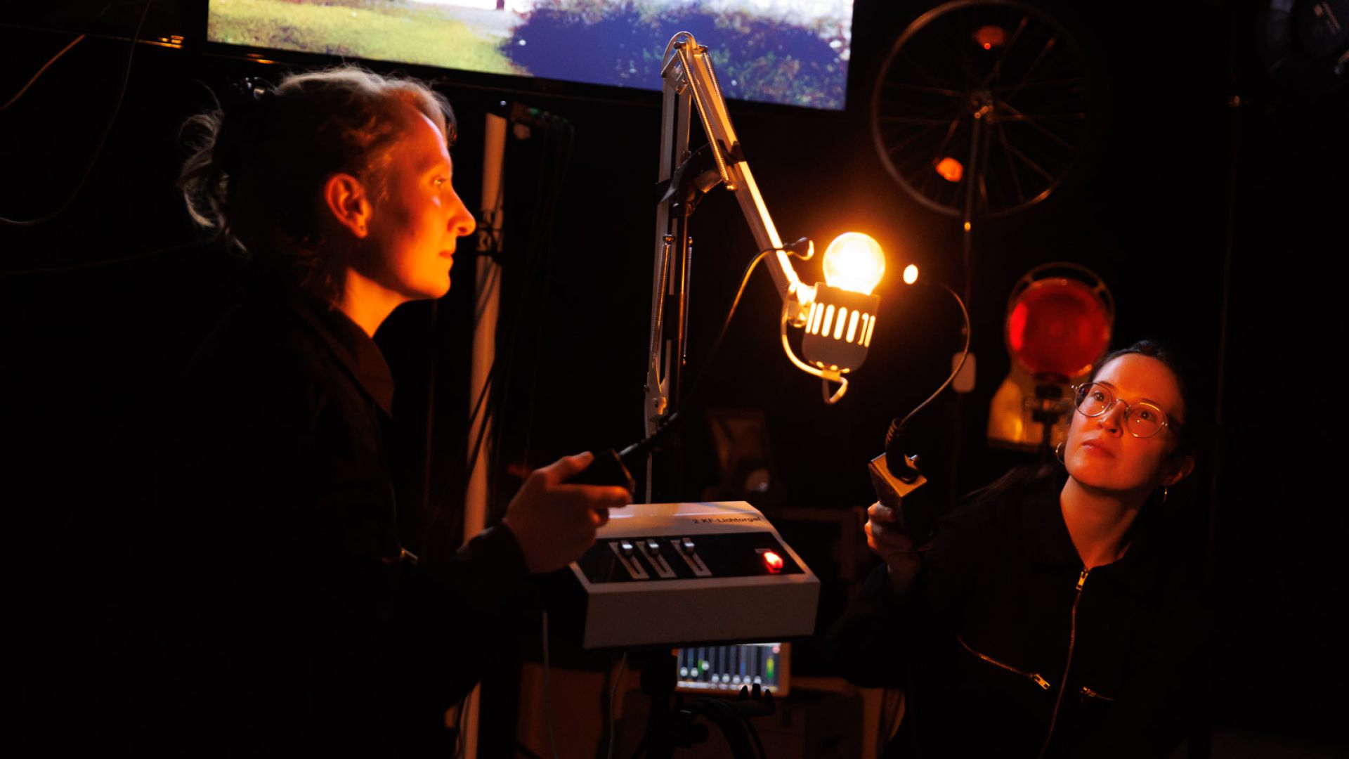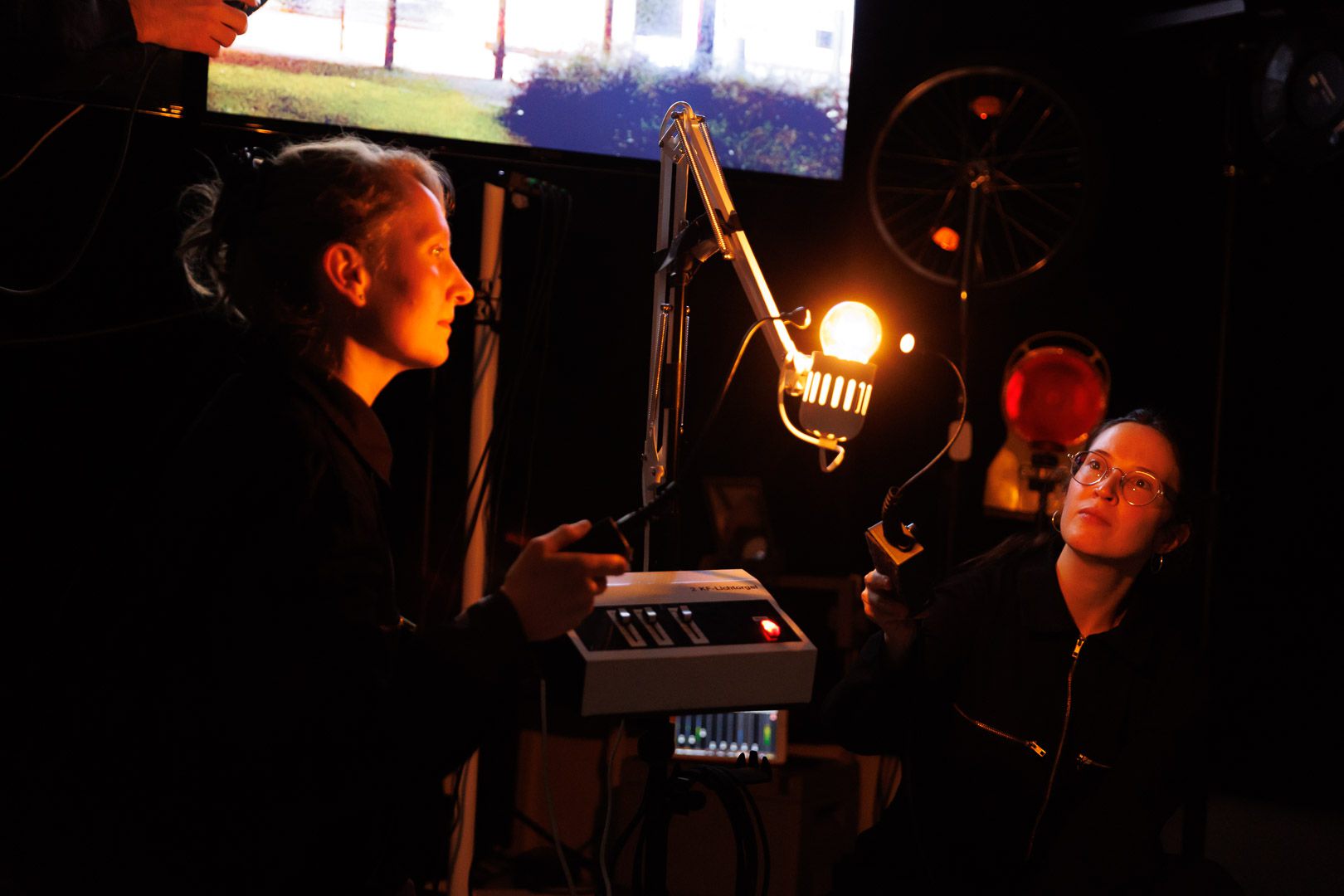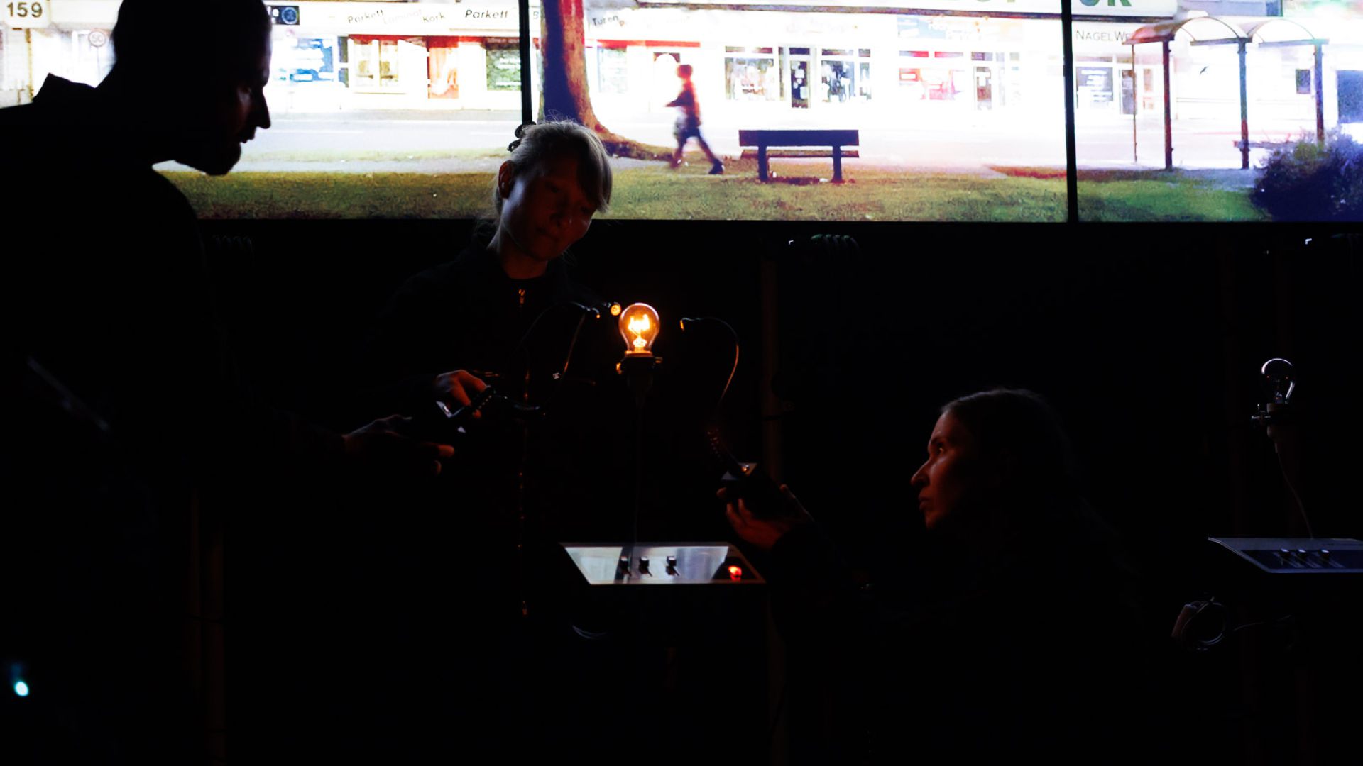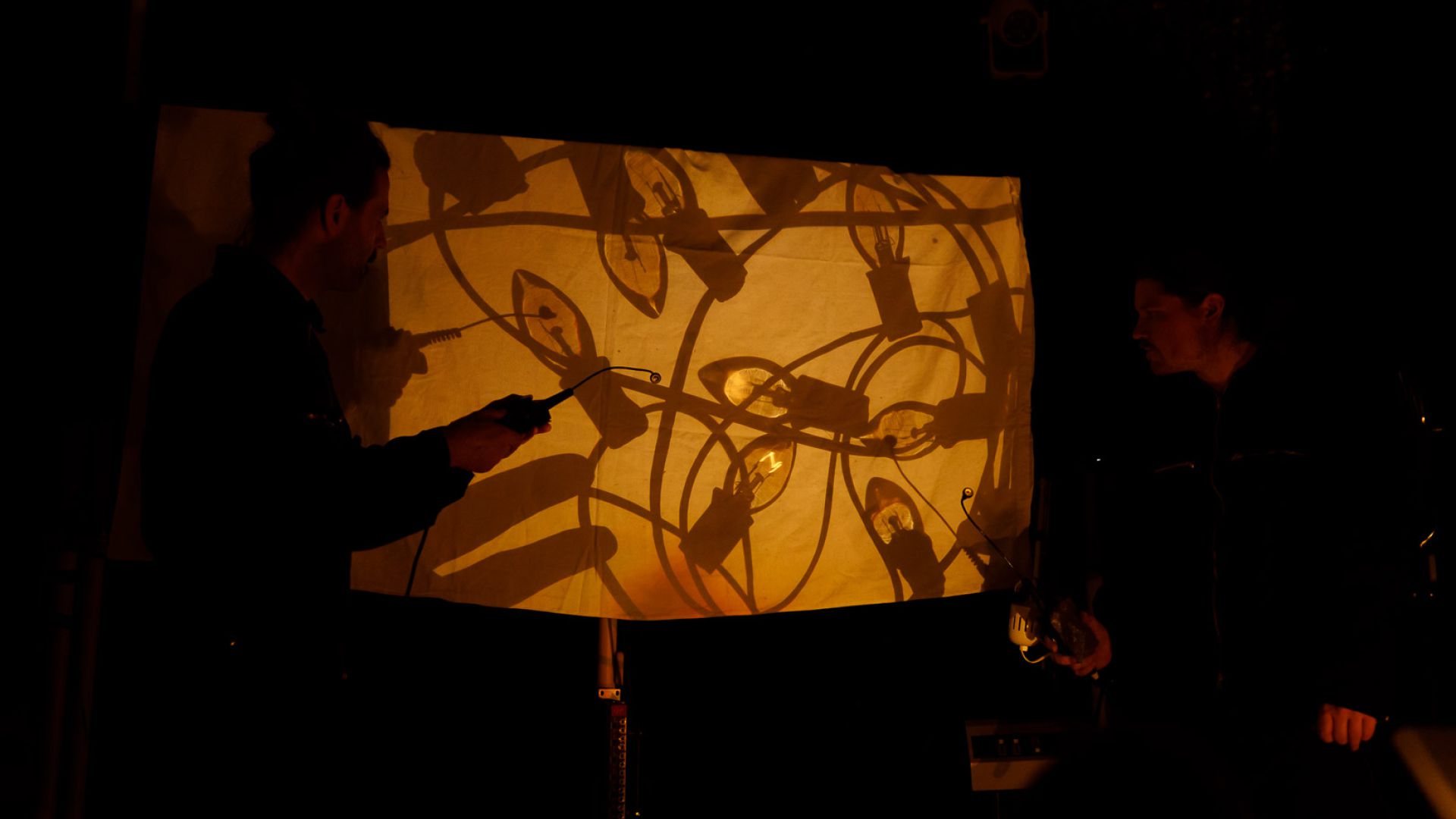 In unserer Arbeit an der Schnittstelle zwischen Objekttheater, Musik und Lichtkunst gestalten wir den Klang von Licht auf unterschiedliche Arten: Einerseits spielen wir mit Elementen wie Shutterblenden oder Linsen sowie mit Bewegung, um den entstehenden Sound über die analoge Manipulation des Materials Licht zu beeinflussen. Andererseits greifen wir die entstehenden Klänge mit Effektgeräten auf, bearbeiten sie live musikalisch weiter und kreieren so klangliche Atmosphären und Soundscapes. Dabei bleiben aber stets die Lichtobjekte die einzigen Klangquellen, die ein teils unberechenbares Eigenleben führen und so die Basis für die in jeder Aufführung leicht variierenden Licht-Klang-Räume bilden.
