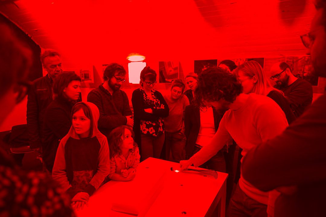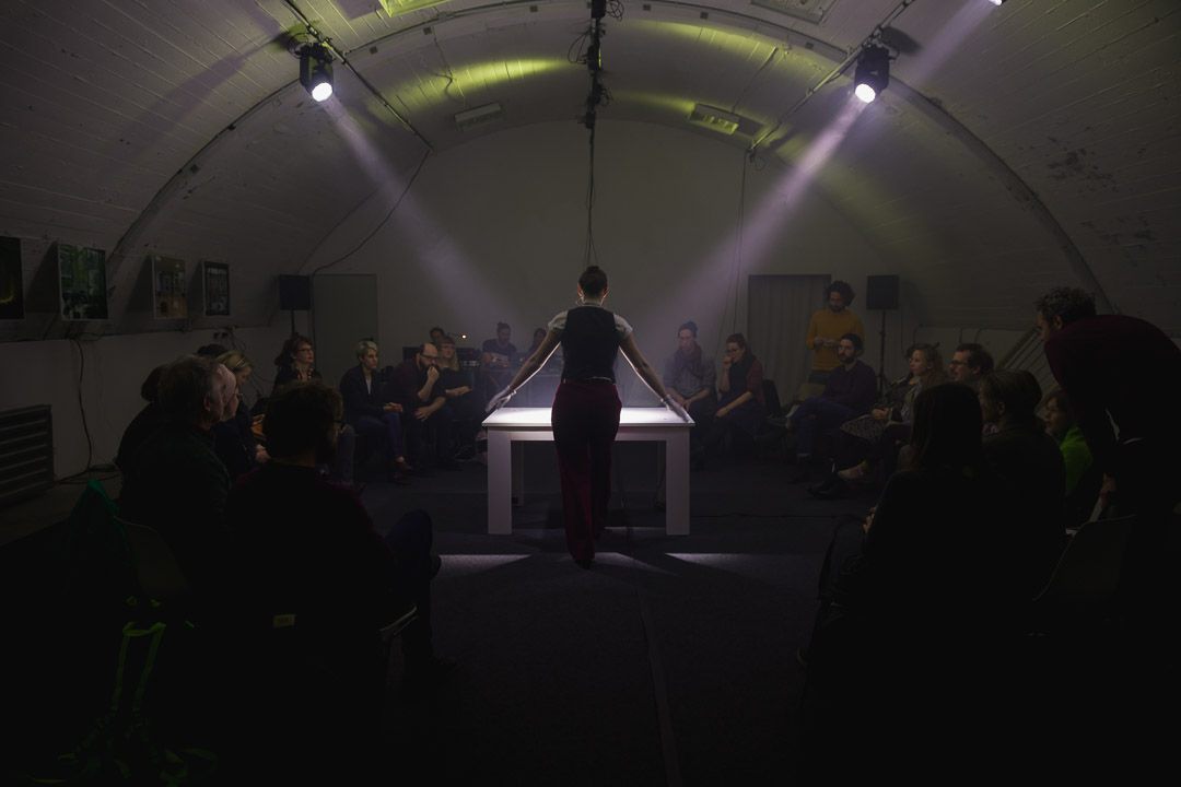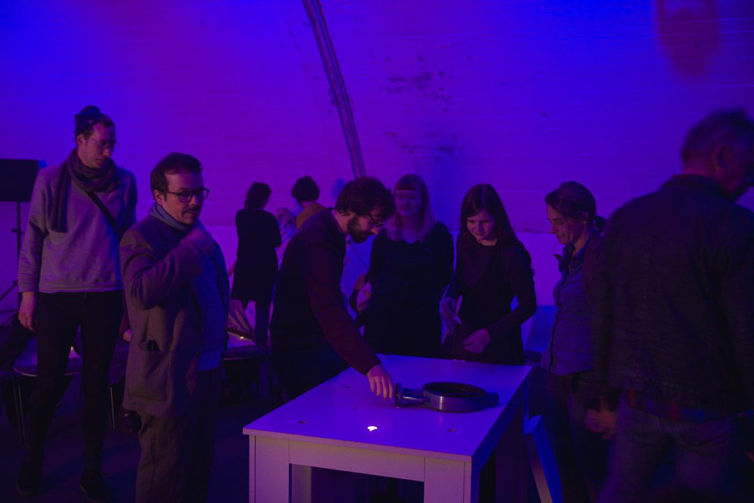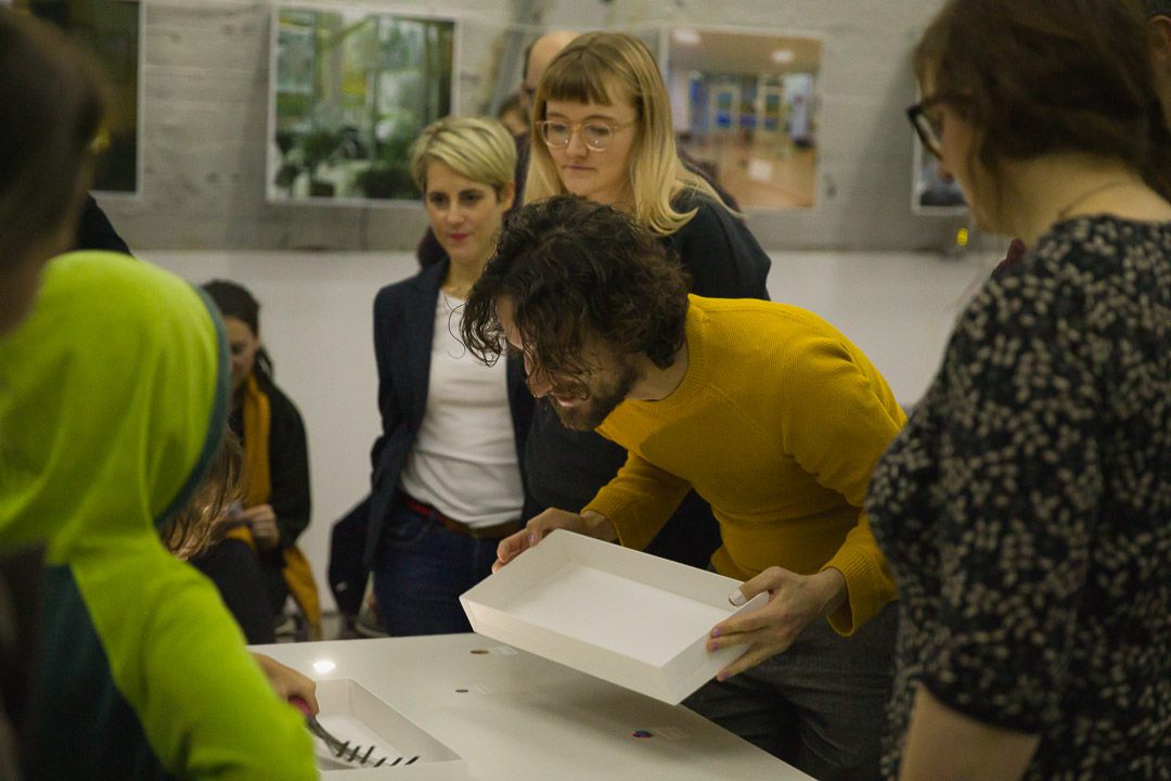 Die Performance (Premiere in den Rottstr5-Kunsthallen) setzt schließlich die Objekte in Szene und verknüpft sie wieder mit ihren Herkunftsorten und den dortigen Installationen. Während der Aufführungen ist das Publikum eingeladen, ein Objekt nach dem anderen aus weißen Boxen auszupacken, zu betrachten, zu testen, zu bespielen. Der Raum reagiert, über Sensoren vermittelt, auf das, was mit den Objekten geschieht – es leuchtet auf, Fetzen der Geräuschkulisse an den Orten und Nebel breiten sich aus, Dinge bewegen sich... Zugleich generieren die Aktivitäten Impulse, die an die Orte gesendet werden, von denen das jeweilige Objekt stammt. So wird bei den Aufführungen an digitalen Fäden gezogen, die überall in der Stadt Installationen auslösen, die zusammen mit der Performance ein vernetztes Kunstwerk bilden.