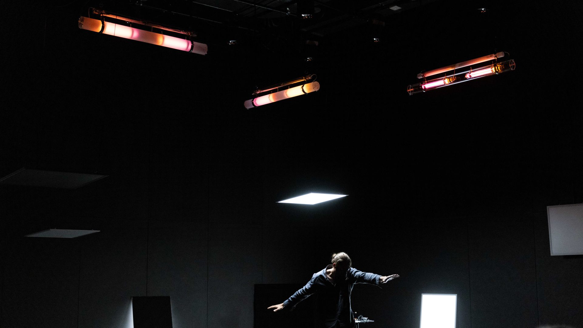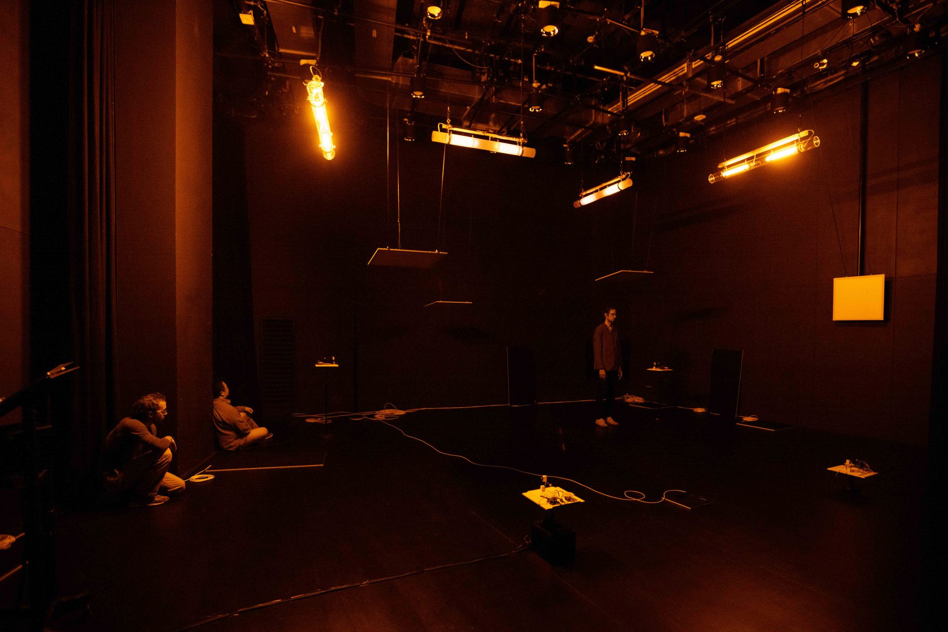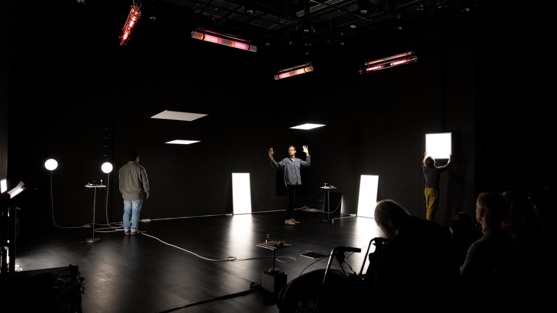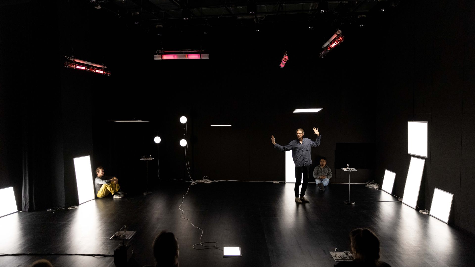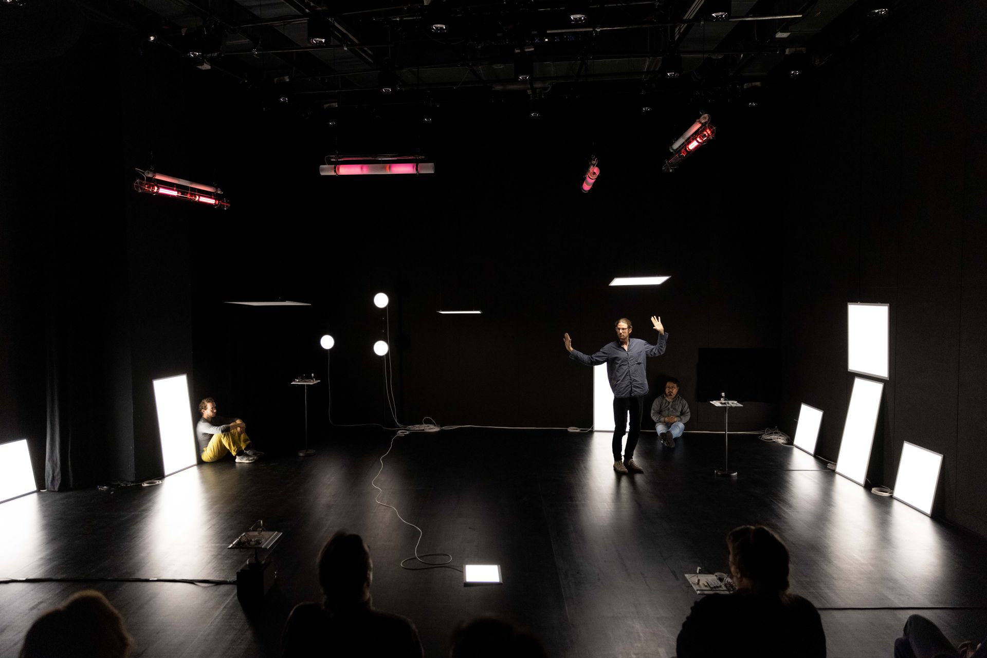Auch auf der Ebene des Lichtdesigns und der Szenografie spielen einerseits Fragen des Sehens, des Verschwindens in der Dunkelheit, des geblendet Seins oder der Farbwahrnehmung und andererseits Aspekte der Vernetzung, Reaktionsketten sowie urbane Raumkonstellationen und Lichtquellen eine Rolle: Auf konventionelle Beleuchtung mit Scheinwerfern sowie auf Frontlicht verzichten wir komplett, stattdessen machen Seiten- und Gegenlicht, Beleuchtung von oben und ein Spiel mit Schatten den Vorgang des Sehens bewusst. Zwei unterschiedliche Beleuchtungselemente, weiße LED-Leuchtflächen und Natriumniederdruckdampflampen, sind neben den Musikmaschinen von miu die einzigen Bühnenemente – sein Minimalismus in der Choreografie spiegelt sich auch in der Szenografie wider. Die beiden Lichtarten mit ihren sehr unterschiedlichen Qualitäten lassen städtische Infrastruktur auf der Bühne erscheinen, öffnen und schließen konkrete wie assoziative Räume, verändern Seheindrücke und reagieren auf die Tänzer. Dabei sind die rechteckigen und runden LED-Leuchtflächen mobile Raumelemente, werden von den Tänzern selbst über die Bühne bewegt und verwandeln sich von rein funktionaler Beleuchtung der Szenerie in Ampeln, Leuchtreklame, Straßenlaternen, Schaufenster, U-Bahnen, Telefonzellen oder Signalleuchten. Mit je einem eigenen langen, weißen Kabel versehen, hinterlässt die Bewegung einer jeden Leuchtfläche Spuren im Bühnenraum. Die Natriumniederdruckdampflampen hingegen, über der Bühne hängend, spielen in ihrer Funktionsweise auf die kabellose Kommunikationsform des Funkens an und tauchen, einmal vom Funke gezündet, nach und nach den gesamten Raum in ein gelbliches Licht. Dieses erinnert nicht nur an das Licht alter Straßenlaternen, es verschluckt – nach einem Farbspiel während der beginnenden Gasentladung – auch Farben, sodass alles in ein monochromes Licht getaucht wird und Sehen nur noch in Graustufen möglich ist.