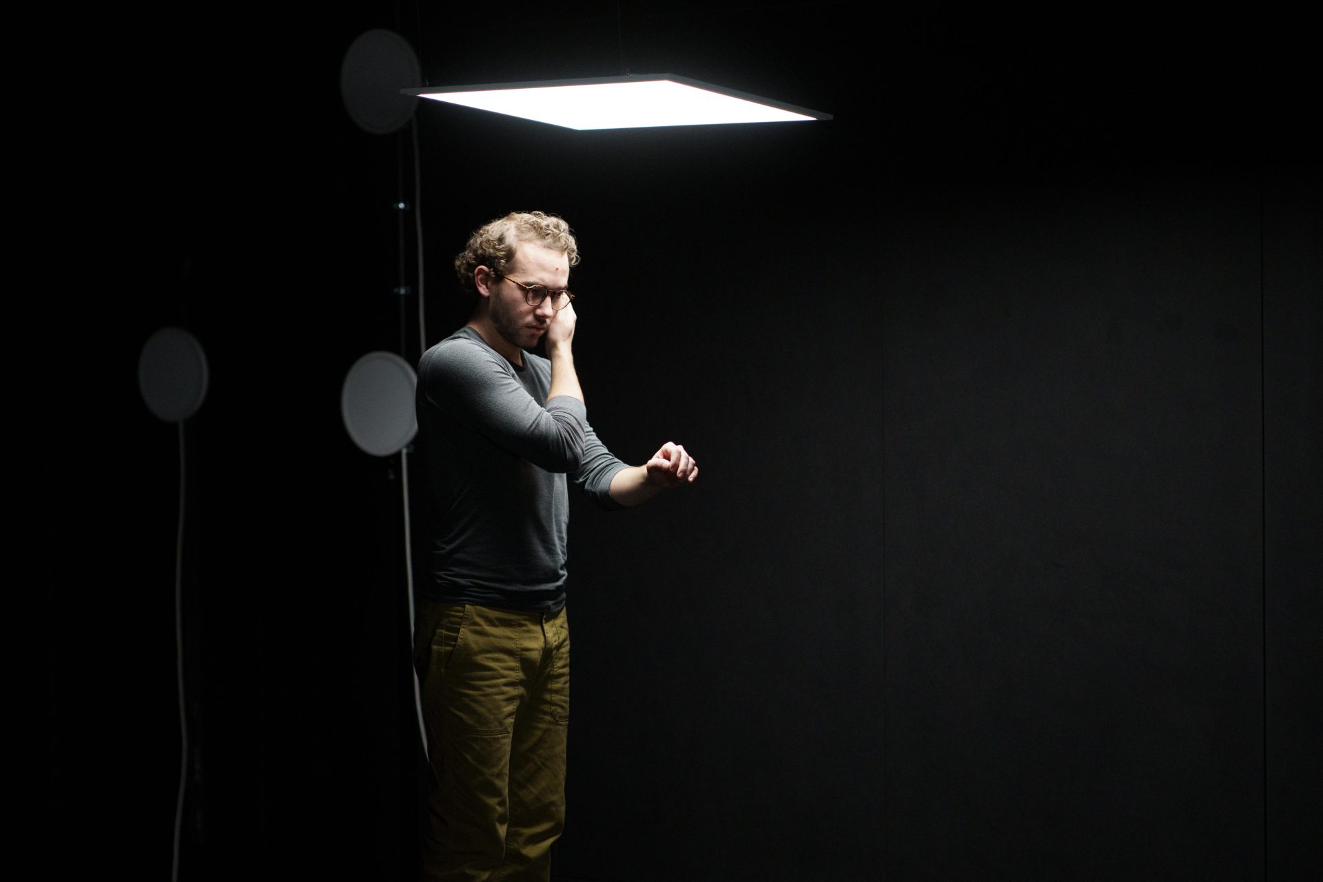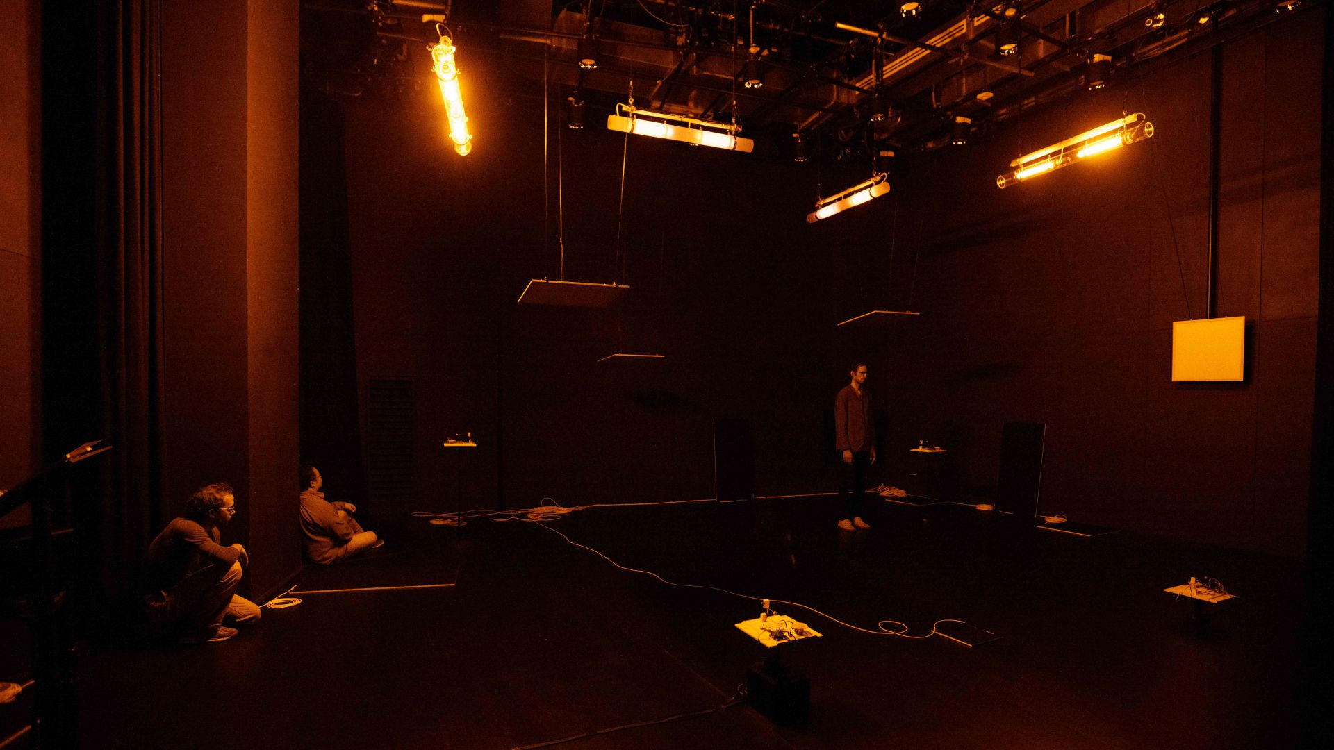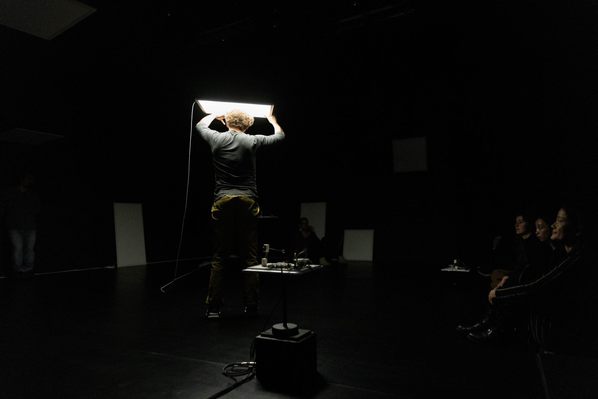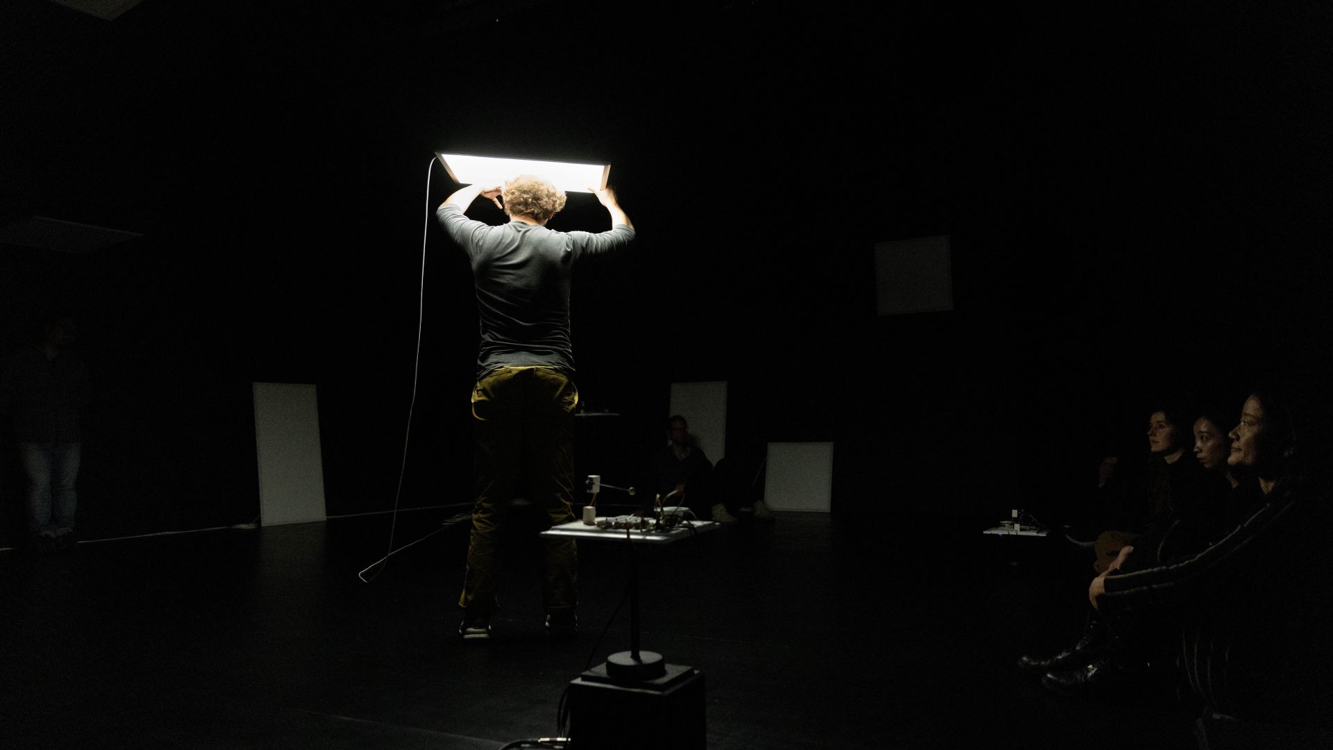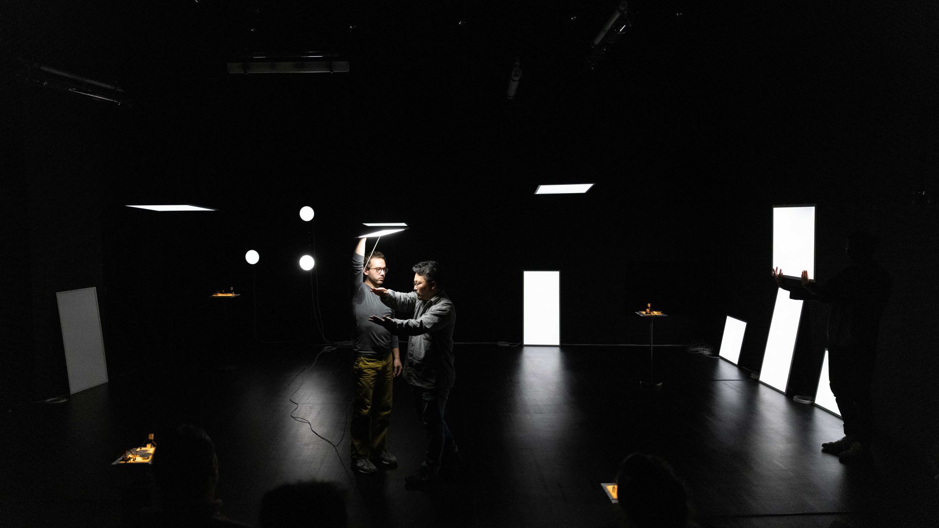 Auch auf der Ebene des Lichtdesigns und der Szenografie spielen einerseits Fragen des Sehens, des Verschwindens in der Dunkelheit, des geblendet Seins oder der Farbwahrnehmung und andererseits Aspekte der Vernetzung, Reaktionsketten sowie urbane Raumkonstellationen und Lichtquellen eine Rolle: Auf konventionelle Beleuchtung mit Scheinwerfern sowie auf Frontlicht verzichten wir komplett, stattdessen machen Seiten- und Gegenlicht, Beleuchtung von oben und ein Spiel mit Schatten den Vorgang des Sehens bewusst. Zwei unterschiedliche Beleuchtungselemente, weiße LED-Leuchtflächen und Natriumniederdruckdampflampen, sind neben den Musikmaschinen von miu die einzigen Bühnenemente – sein Minimalismus in der Choreografie spiegelt sich auch in der Szenografie wider. Die beiden Lichtarten mit ihren sehr unterschiedlichen Qualitäten lassen städtische Infrastruktur auf der Bühne erscheinen, öffnen und schließen konkrete wie assoziative Räume, verändern Seheindrücke und reagieren auf die Tänzer. Dabei sind die rechteckigen und runden LED-Leuchtflächen mobile Raumelemente, werden von den Tänzern selbst über die Bühne bewegt und verwandeln sich von rein funktionaler Beleuchtung der Szenerie in Ampeln, Leuchtreklame, Straßenlaternen, Schaufenster, U-Bahnen, Telefonzellen oder Signalleuchten. Mit je einem eigenen langen, weißen Kabel versehen, hinterlässt die Bewegung einer jeden Leuchtfläche Spuren im Bühnenraum. Die Natriumniederdruckdampflampen hingegen, über der Bühne hängend, spielen in ihrer Funktionsweise auf die kabellose Kommunikationsform des Funkens an und tauchen, einmal vom Funke gezündet, nach und nach den gesamten Raum in ein gelbliches Licht. Dieses erinnert nicht nur an das Licht alter Straßenlaternen, es verschluckt – nach einem Farbspiel während der beginnenden Gasentladung – auch Farben, sodass alles in ein monochromes Licht getaucht wird und Sehen nur noch in Graustufen möglich ist.