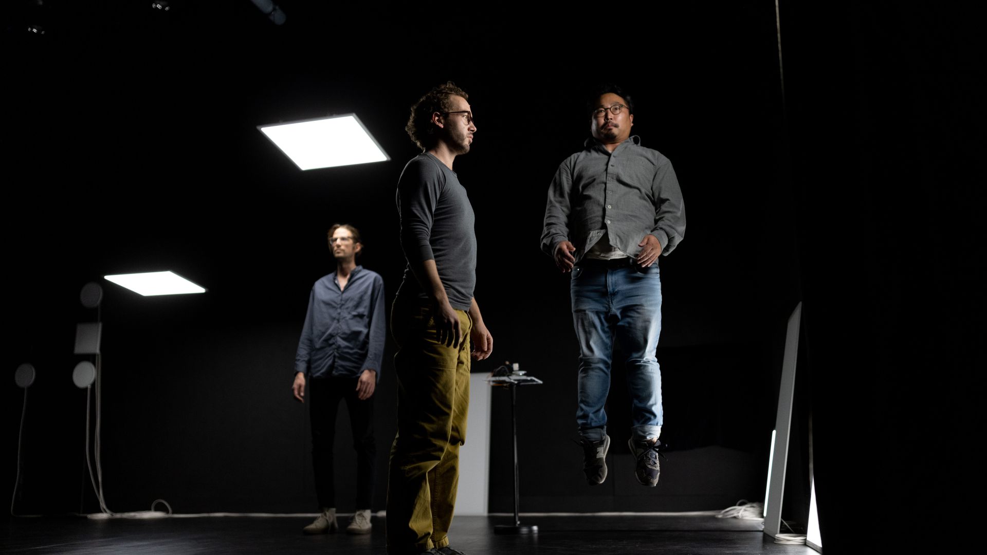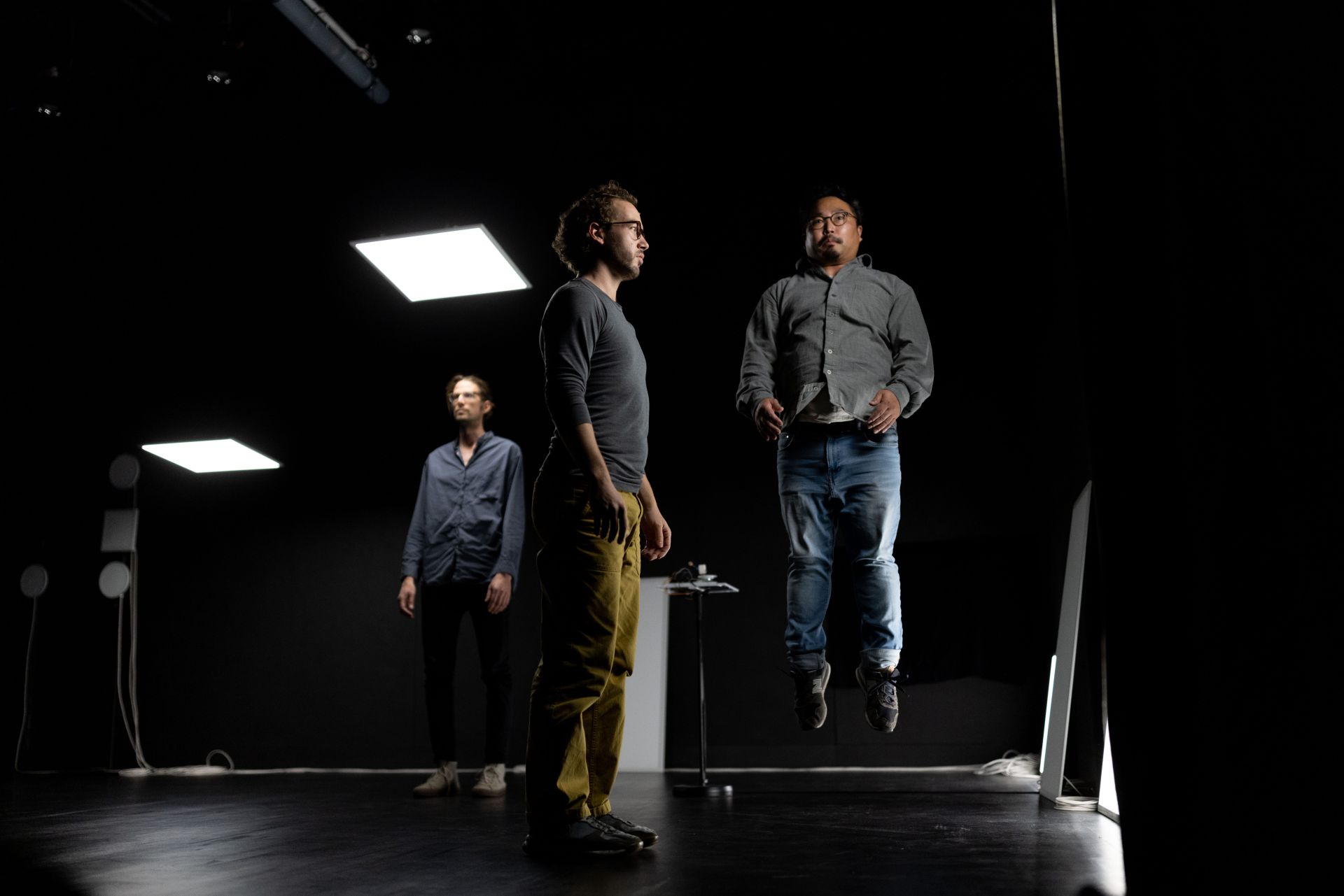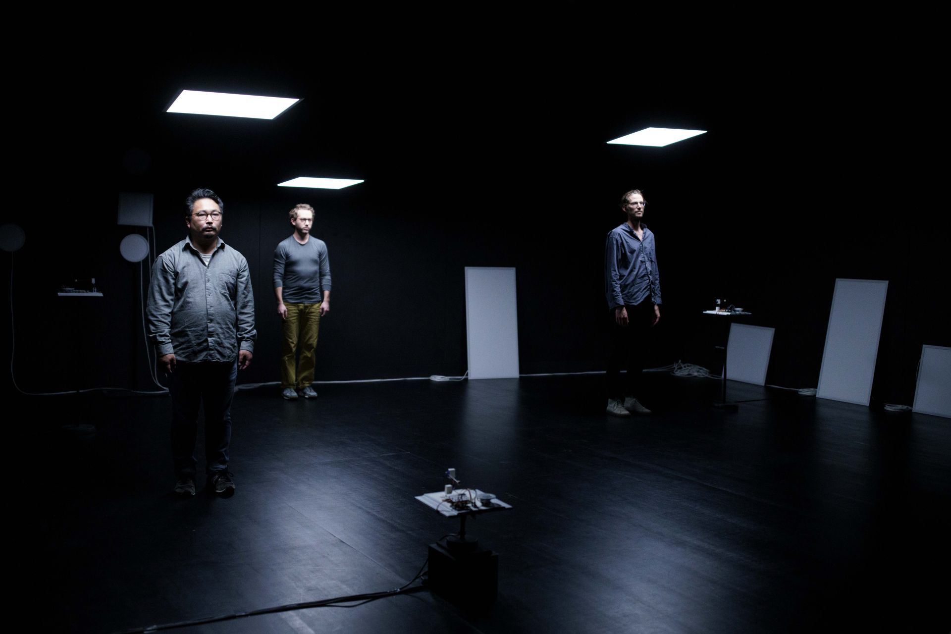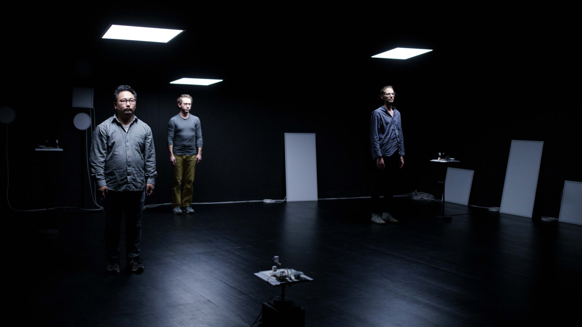 Die Performance lädt sehendes, anders sehendes und nicht sehendes Publikum zu einem Kunsterlebnis ein, bei dem eine offene Audiodeskription in deutscher und japanischer Sprache als eigenständiges künstlerisches Mittel Teil des Stücks ist. Was wird beschrieben, was nicht? Bis wohin geht Beschreibung, ab wann ist sie Kommentar, Interpretation, erzählt eine eigene Geschichte und ergänzt das, was sich auf der Bühne abspielt, um eine weitere, für alle nicht sichtbare Ebene? Wohin lenkt die Sprache den Blick der Sehenden, wo ergänzt sie ihn, wo widerspricht sie ihm vielleicht? Zusätzlich zum Zugang durch die Audiodeskription wird vor den Vorstellungen eine Tastführung angeboten, bei der die Performer, Soya Arakawa, Baptiste Bersoux und Niels Bovri sich, das Stück und den Bühnenraum vorstellen.