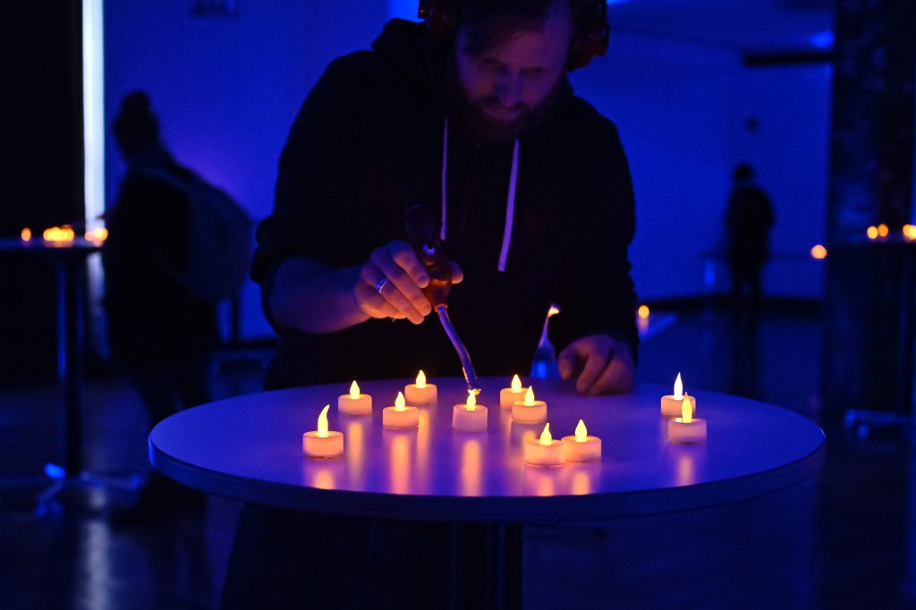 Habt ihr euch schonmal gefragt, wie LED-Teelichter eigentlich klingen? In unserer Licht- und Klanginstallation sound of silence könnt ihr das herausfinden! Ausgestattet mit einem ,Optokoppler', der Licht in hörbaren Klang transformiert, könnt ihr euch durch einen Raum voller LED-Kerzen bewegen und deren aktustische Ebene entdecken. Von leisem Rauschen über Beats und Töne, die zu Tonleitern und Melodien arrangiert werden können, bis hin zu ganzen Liedern steckt jede Menge Klang in den ganz alltäglichen Lichtobjekten. Kommt vorbei, bastelt euch euren eigenen Klangraum und findet heraus, wie Lieder in die – von den uns keineswegs manipulierten – LED-Teelichter kommen!