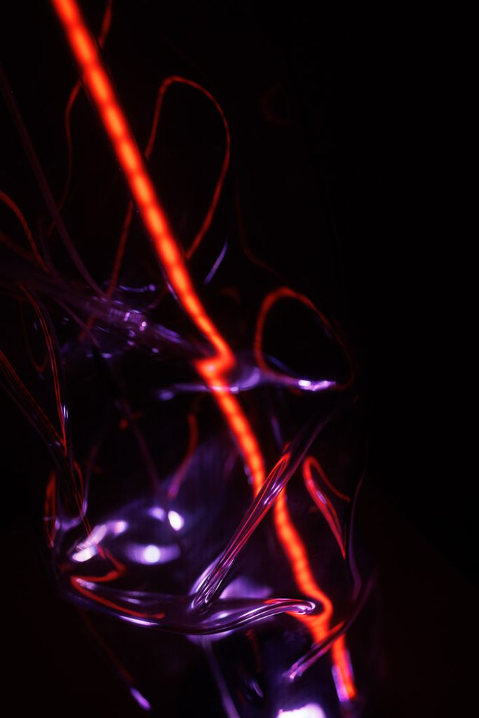 Dunstglas spielt mit Aggregatzuständen und der gegenseitigen Beeinflussung verschiedener Materialen: Festes Acrylglas in fließende Formen gebracht bildet zwei hohle Körper. In den Gebilden aus Acryl leuchten Neonröhren, deren Plasma mal wie ein starrer Stab wirkt, mal zu fließen scheint, mal perlt. Von Zeit zu Zeit steigt Dunst in der Skulptur auf und macht das an sich transparente Material undurchsichtiger. Doch der Dunst trübt den Blick dabei nicht nur. Er macht auch etwas sichtbar: In seinen Partikeln bricht sich Licht, das in den Acrylgebilden aufsteigt, durch den Dunst gebrochen und reflektiert wird, sich ausbreitet, die Neonröhren umhüllt und den Eindruck ihres Lichts verändert. So sorgt jedes Element dafür, dass die übrigen anders gesehen werden können, als dies einzeln der Fall wäre. Die Skulptur wird im Frühjahr 2024 als interaktives szenografisches Element im Rahmen des Album Release Konzerts von YENGA Premiere feiern und mit deren Musik zusammenspielen.