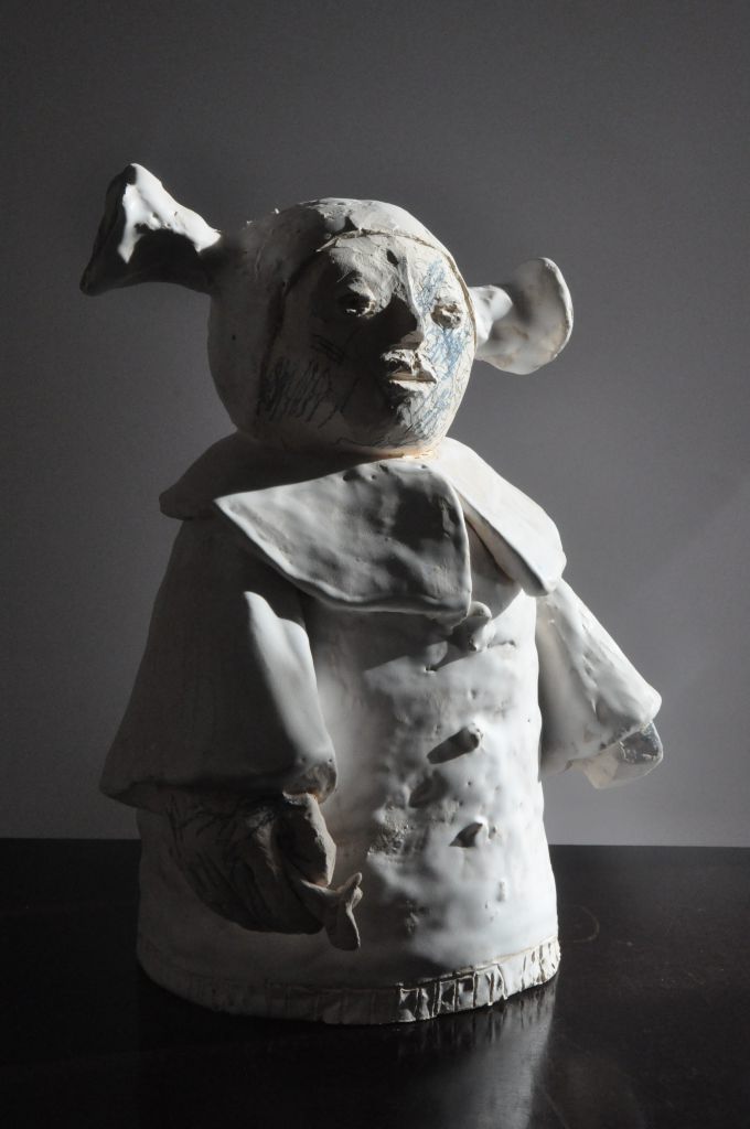 Bild aus der Fotoserie "Galaxy" von Sven Neidig, Gemälde "26.04.2025" von Susanne Cui, Plastik "Die Fremden" aus glasierter Keramik von Dorothee Schäfer.