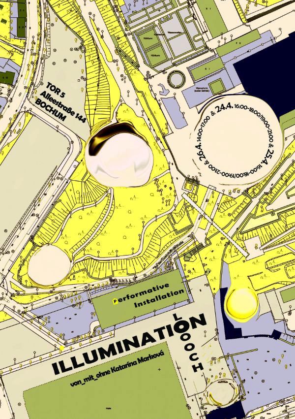 In ihrer Arbeit ILLUMINATION LOOOCH setzt sich Katarína Marková mit Löchern und Gängen, der unterirdischen Infrastruktur, die die Bergbau und Industrie im Ruhrgebiet hinterlassen hat, auseinander. Sie fragt in ihrer Beschäftigung mit den Hohlräumen unter dem Bochumer Westpark unter anderem danach, was in den unterirdischen Räumen zurück gelassen und vergessenwurde, was mit dem Rest, dem Übriggebliebenen, dem, das nicht mehr gebraucht wird passiert. Was ist ein Loch? Ein Nichts, in unsichtbarer Dunkelheit?