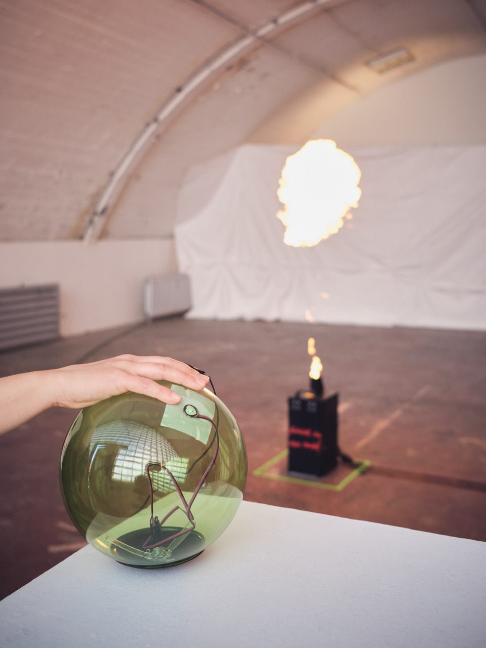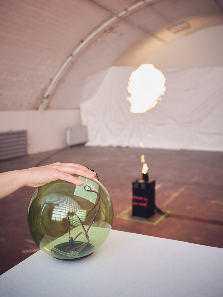 Birk-André Hildebrandt gestaltet im Rahmen von Fühlst du das auch? einen Raum, der mit allen Sinnen wahrgenommen und mit dem eigenen Körper(gefühl) beeinflusst werden kann: Mit dem eigenen Puls können Feuerbälle ausgelöst werden, die Luft vor einem zum Flirren und Zischen gebracht werden. Wenn der eigene Puls vor einem im Raum schwebt, geht der Puls in die Höhe – im wahrsten Sinne des Wortes.