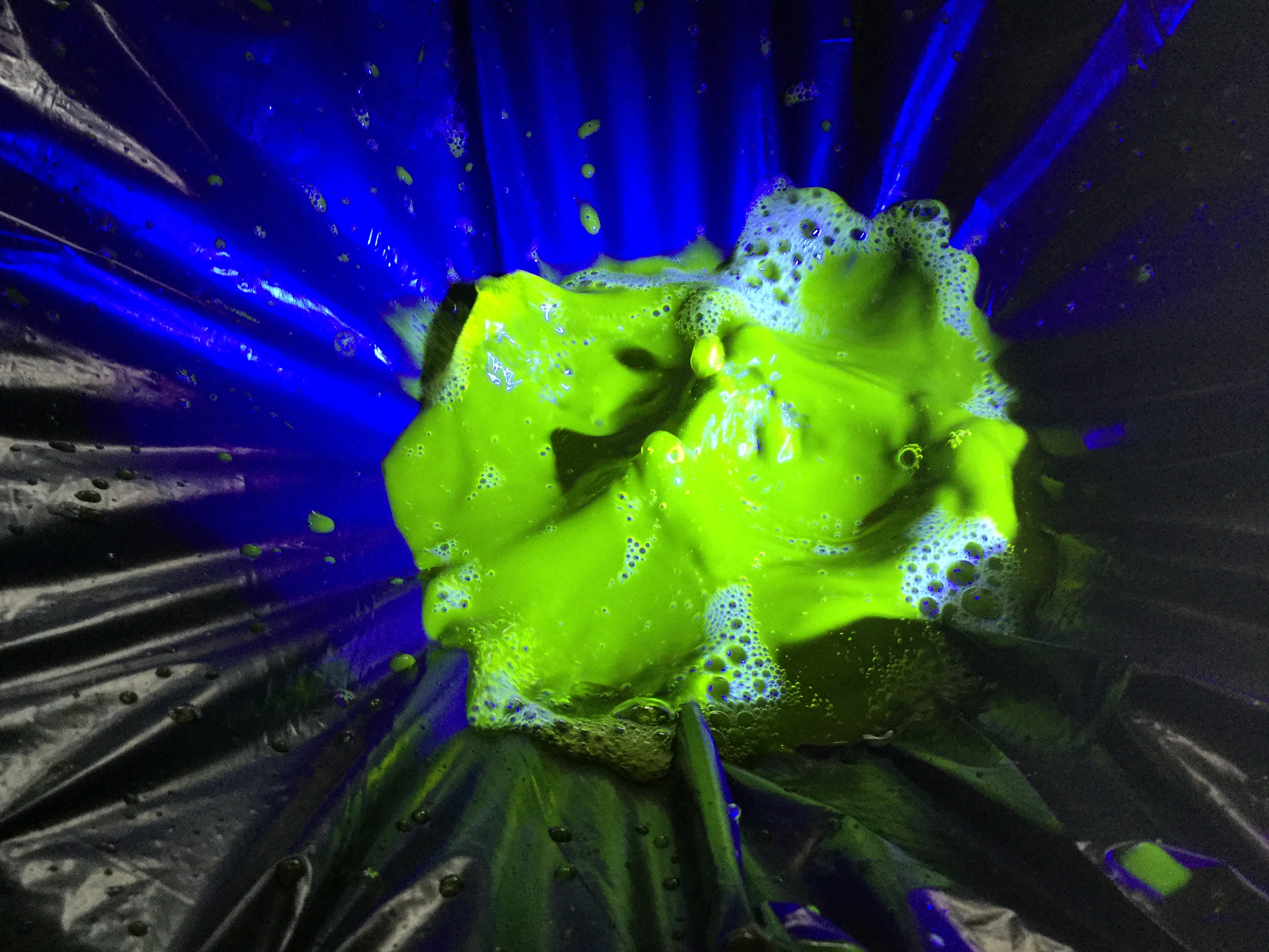 Mehr und mehr haben wir schließlich Wasser mit uns vertrauten Materialien kombiniert, mit denen wir bereits mehrfach gearbeitet haben. Über deren Interaktion mit Wasser konnten wir mehr über dessen Eigenschaften und ästhetisches sowie choreografisches Potenzial erfahren: In Kombination mit Licht haben wir mit Reflexionen gespielt, die den gesamten Raum in Oberflächenstrukturen des Wassers getaucht haben, die sich bei steigender/sinkender Temperatur des Wassers und dessen Bewegung stetig veränderten. In Kontakt mit Acrylglas und Folien haben wir aus vernebeltem Wasser akkurate Matrizen von Tropfen erzeugt, die wie unzählige Glaskugeln kopfüber Ausschnitte aus der Welt als Spiegelung einfangen – und Assoziationen zu Insekteneiern eröffnen, aus denen Bilder, Geschichten, ja ganze Welten schlüpfen könnten. Zusammengebracht mit Schallwellen konnten wir en miniature Gewässer vom stillen See über die sich sanft kräuselnde Pfütze bis hin zum heftig wogenden Meer erzeugen. Verbunden mit Farbe und UV-Licht hat sich das Wasser schließlich in eine leuchtende pulsierende Masse mit scheinbarem Eigenleben verwandelt, die langfristig in unsere zukünftige Arbeit einfließen wird.